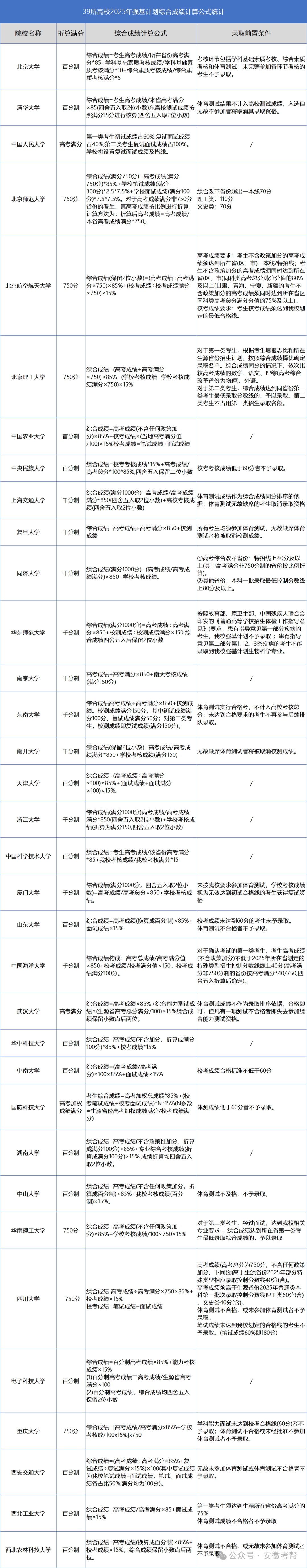 1️⃣各高校综合成绩满分基本上为百分制、千分制、或750满分,录取成绩由85%的高考成绩和15%的校测成绩组成(除国防科大加权外)。