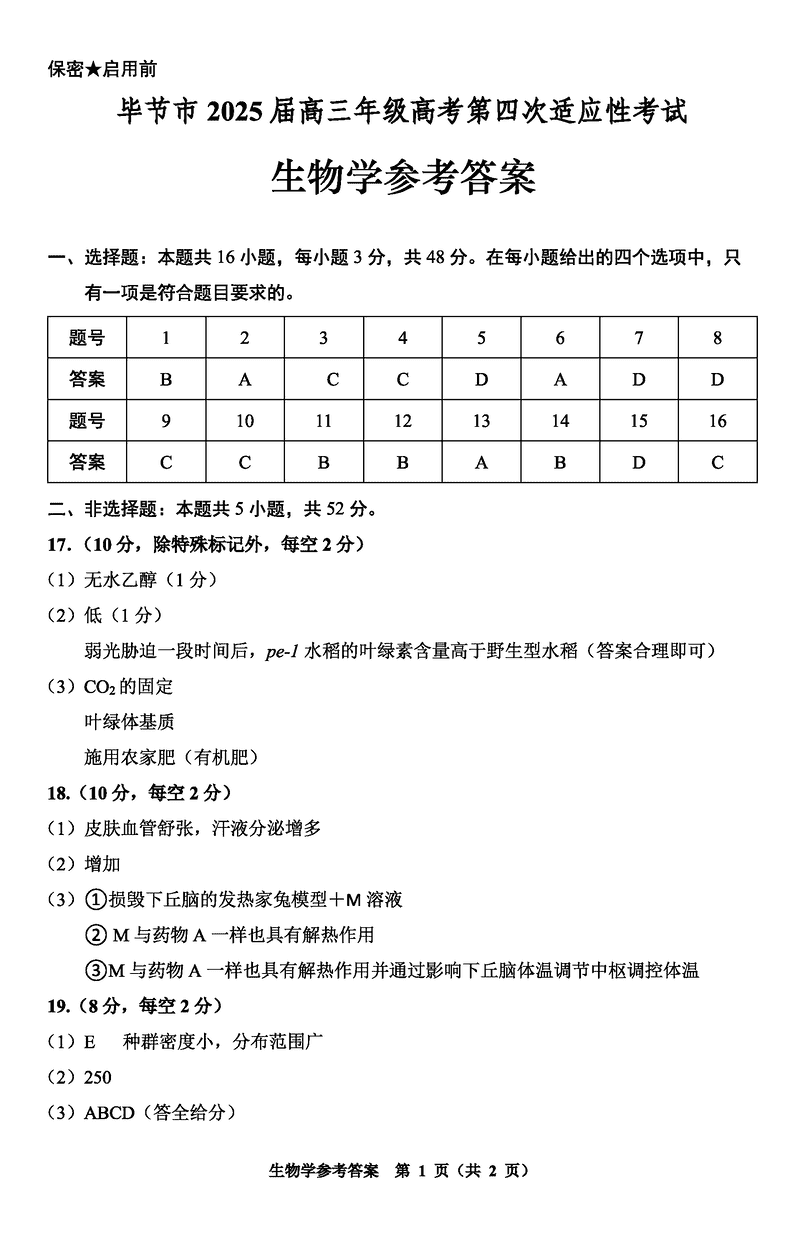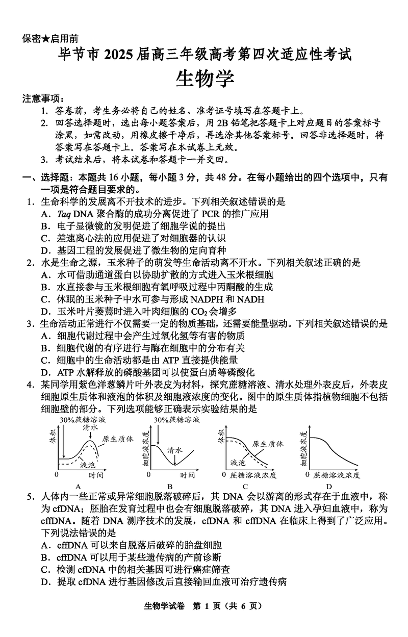 毕节四诊2025届高考第四次适应性考生物试题及答案 时间:2025-05-18 贵州 理综试题 贵州毕节2025届高考第四次适应性考生物考试已于近日开考,为方便考生考后及时查看考试情况,查漏补缺、弥补不足,本文整理了试题答案解析相关信息! 汇总:贵州毕节2025届高考第四次适应性考试试题及答案汇总 生物试题及答案解析