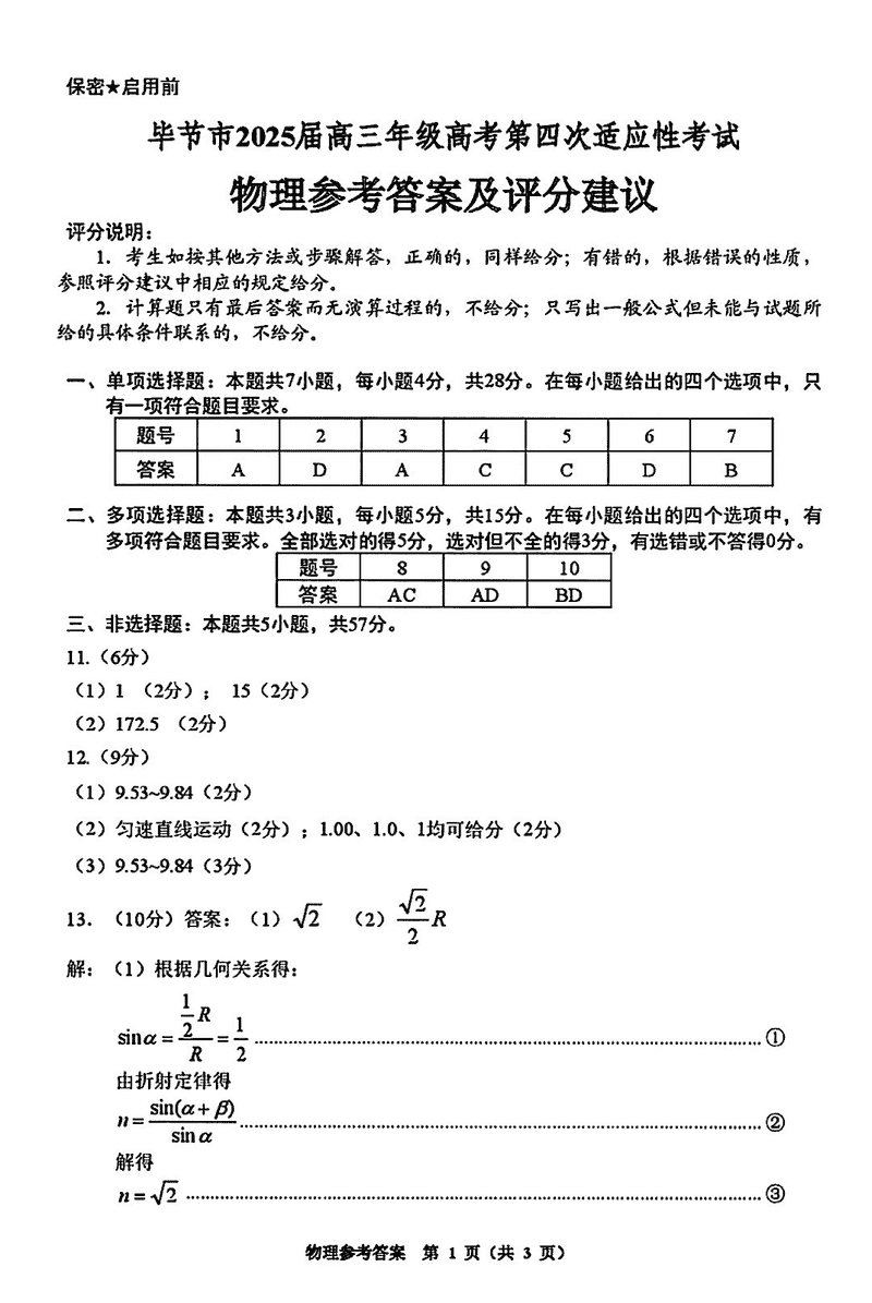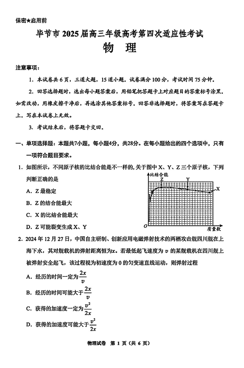 毕节四诊2025届高考第四次适应性考物理试题及答案 时间:2025-05-18 贵州 理综试题 贵州毕节2025届高考第四次适应性考物理考试已于近日开考,为方便考生考后及时查看考试情况,查漏补缺、弥补不足,本文整理了试题答案解析相关信息! 汇总:贵州毕节2025届高考第四次适应性考试试题及答案汇总 物理试题及答案解析