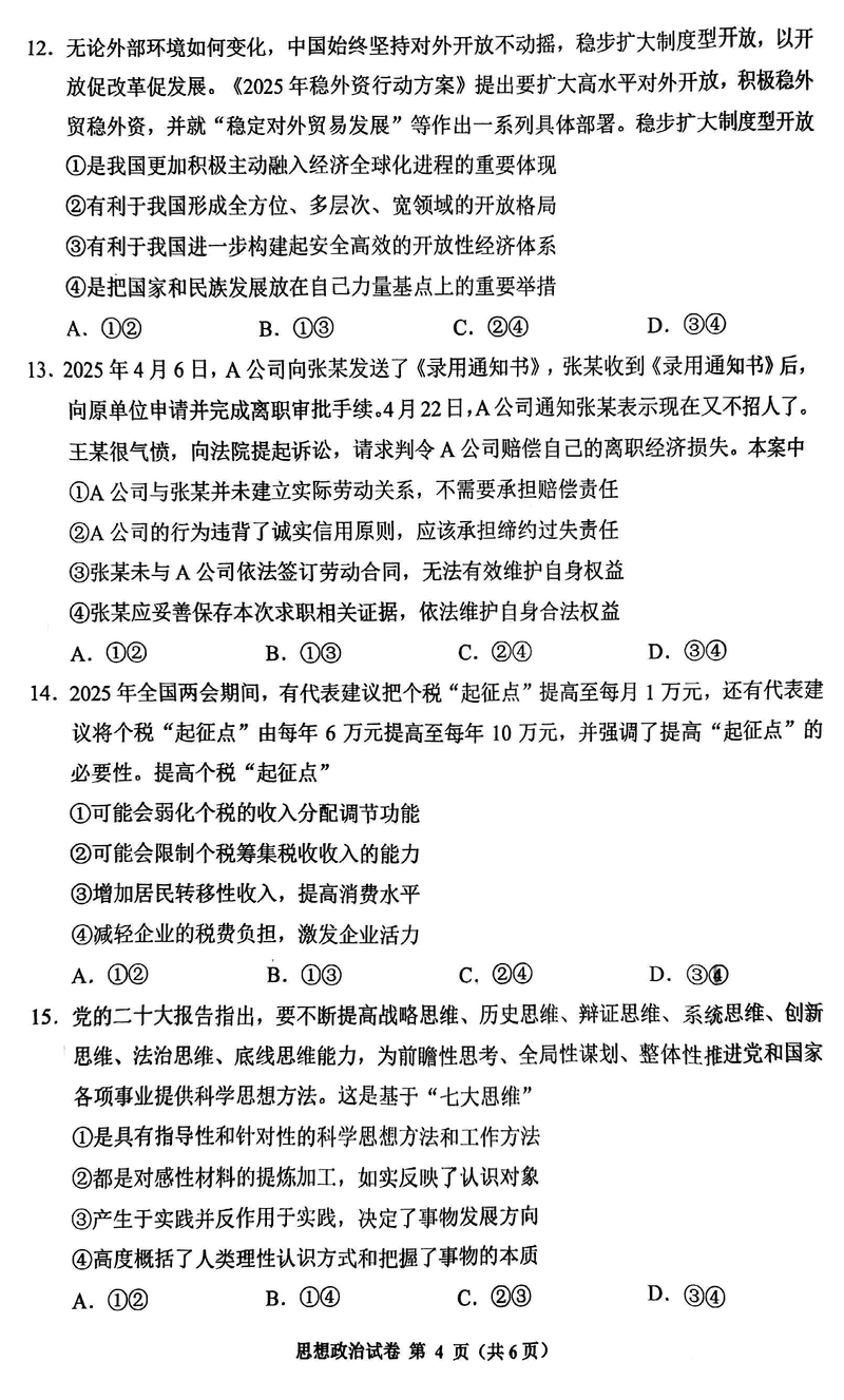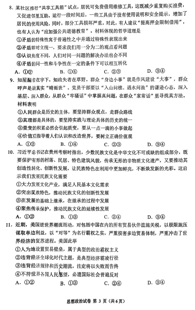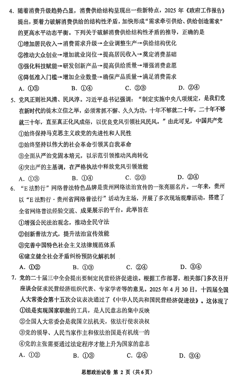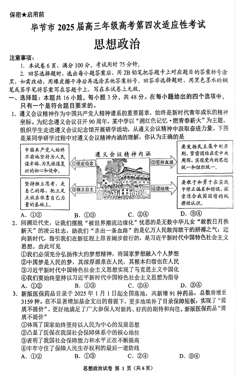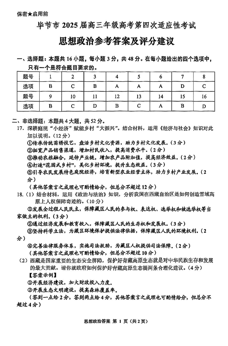 毕节四诊2025届高考第四次适应性考政治试题及答案 时间:2025-05-18 贵州 文综试题 贵州毕节2025届高考第四次适应性考政治考试已于近日开考,为方便考生考后及时查看考试情况,查漏补缺、弥补不足,本文整理了试题答案解析相关信息! 汇总:贵州毕节2025届高考第四次适应性考试试题及答案汇总 政治试题及答案解析