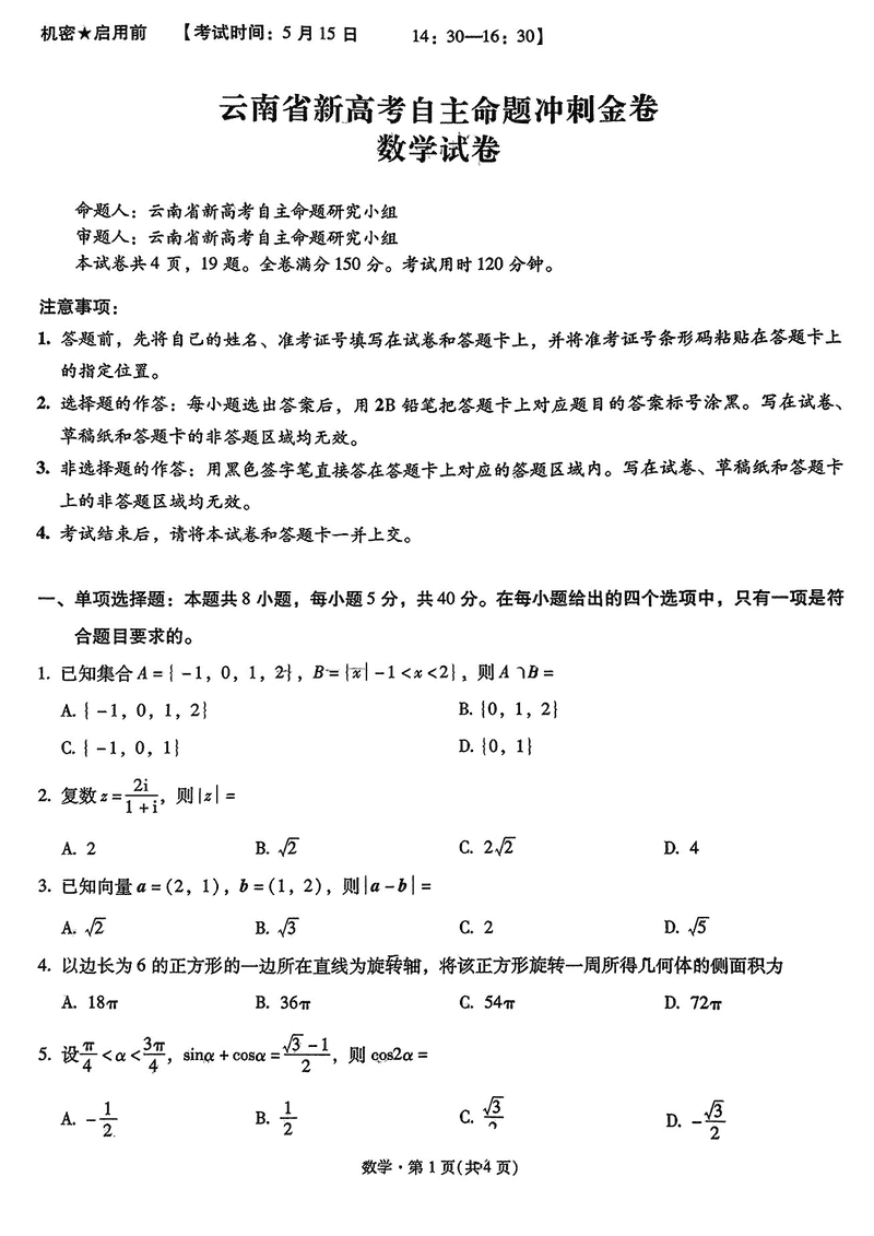 2025年云南省新高考自主命题冲刺金卷数学试题及答案 时间:2025-05-18 云南 数学试题 2025年云南省新高考自主命题冲刺金卷数学考试已于近日开考,为方便考生考后及时查看考试情况,查漏补缺、弥补不足,本文整理了试题答案解析相关信息! 汇总:2025年云南省新高考自主命题冲刺金卷试题及答案汇总 数学试题及答案解析