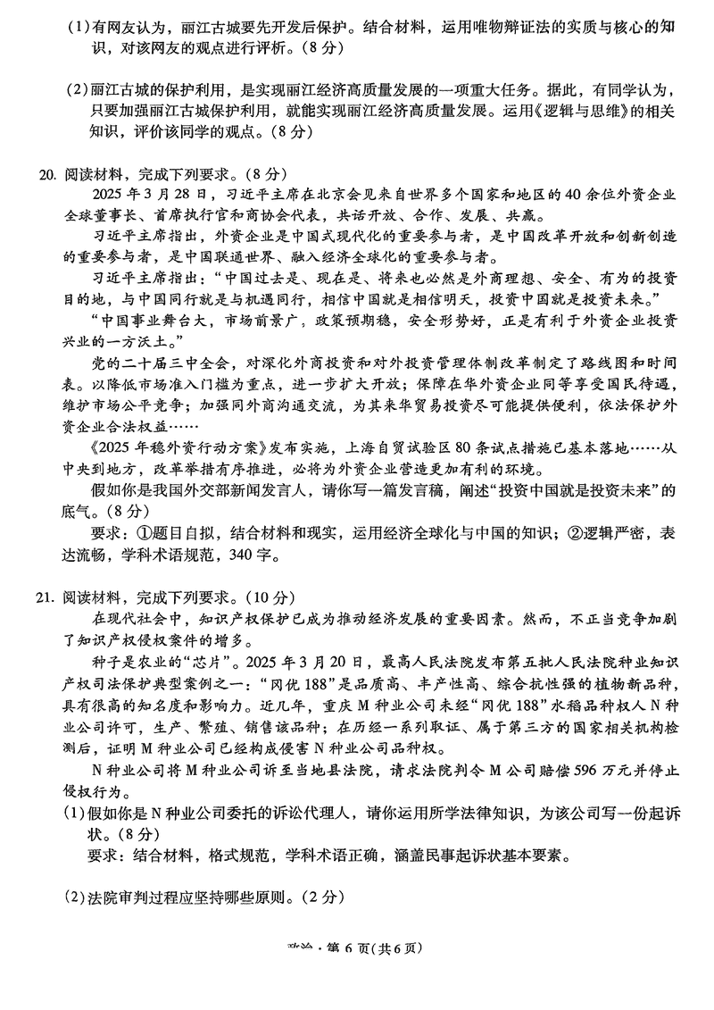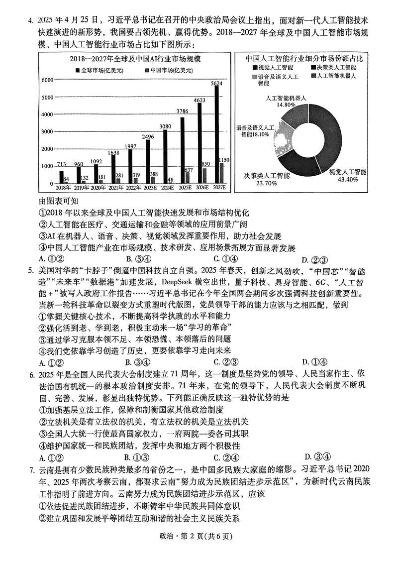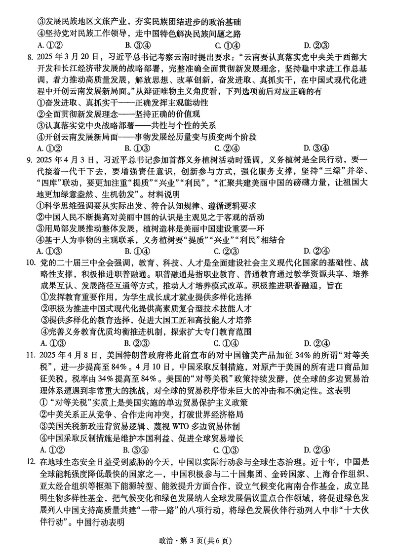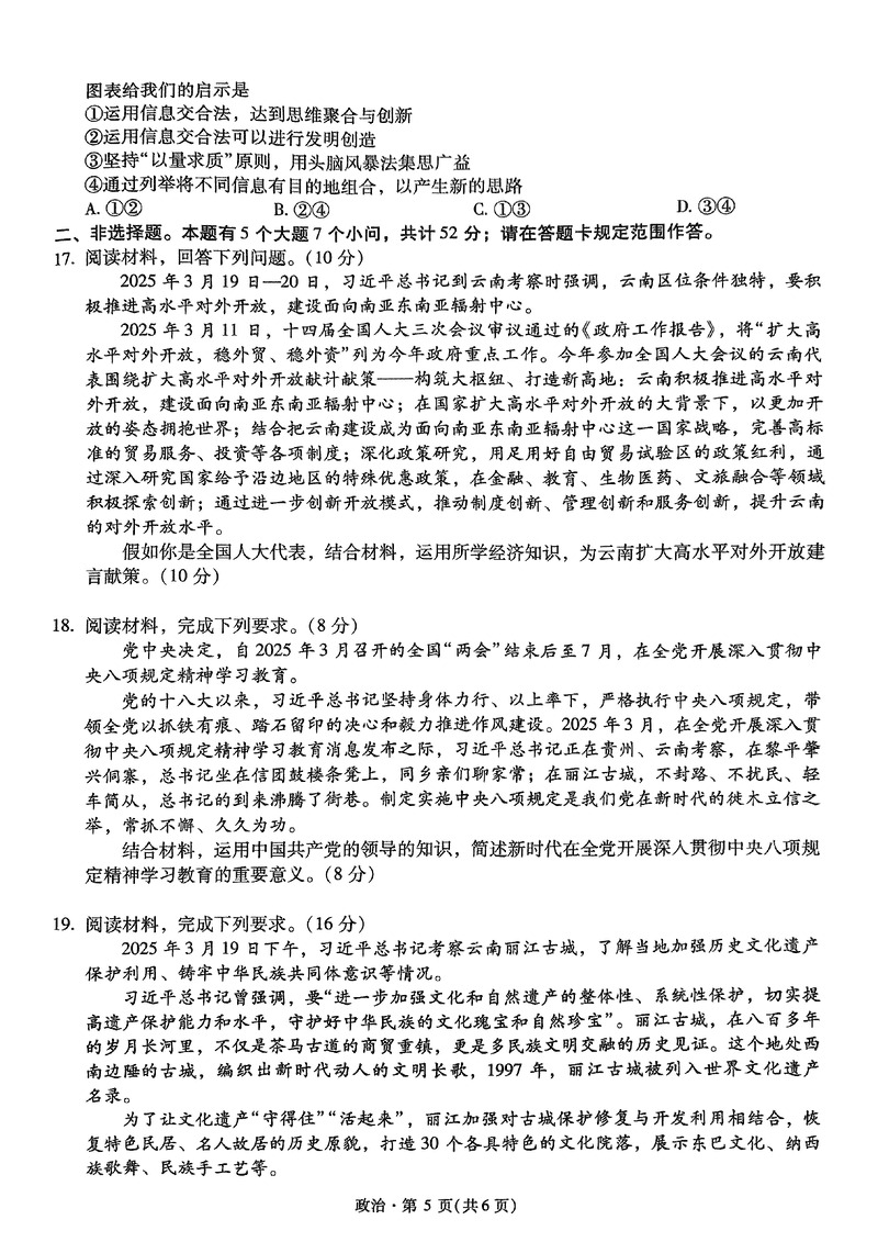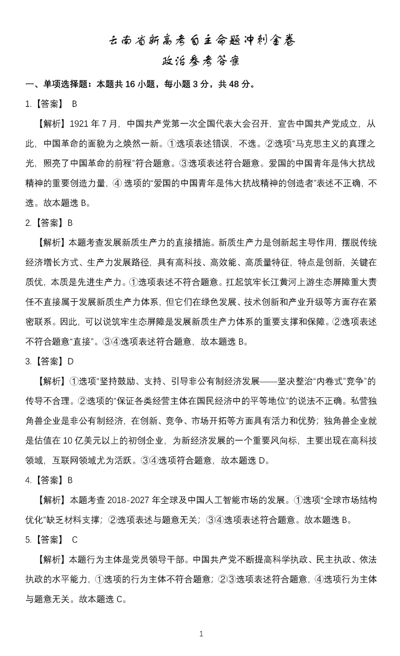 2025年云南省新高考自主命题冲刺金卷政治试题及答案 时间:2025-05-18 云南 文综试题 2025年云南省新高考自主命题冲刺金卷政治考试已于近日开考,为方便考生考后及时查看考试情况,查漏补缺、弥补不足,本文整理了试题答案解析相关信息! 汇总:2025年云南省新高考自主命题冲刺金卷试题及答案汇总 政治试题及答案解析