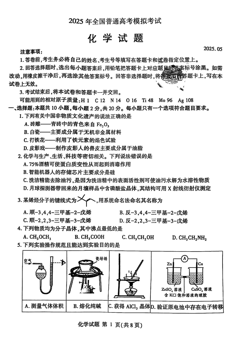山东四县联考2025年5月高考模考化学试题及答案 时间:2025-05-18 山东 理综试题 山东四县联考(日照五莲+潍坊安丘+诸城+临沂兰山)2025年5月高考模考化学考试已于近日开考,为方便考生考后及时查看考试情况,查漏补缺、弥补不足,本文整理了试题答案解析相关信息! 汇总:山东四县联考2025年5月高考模考试题及答案汇总 化学试题及答案解析