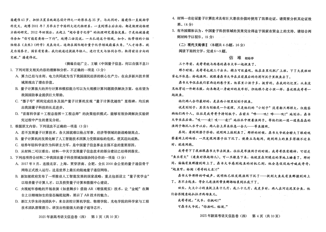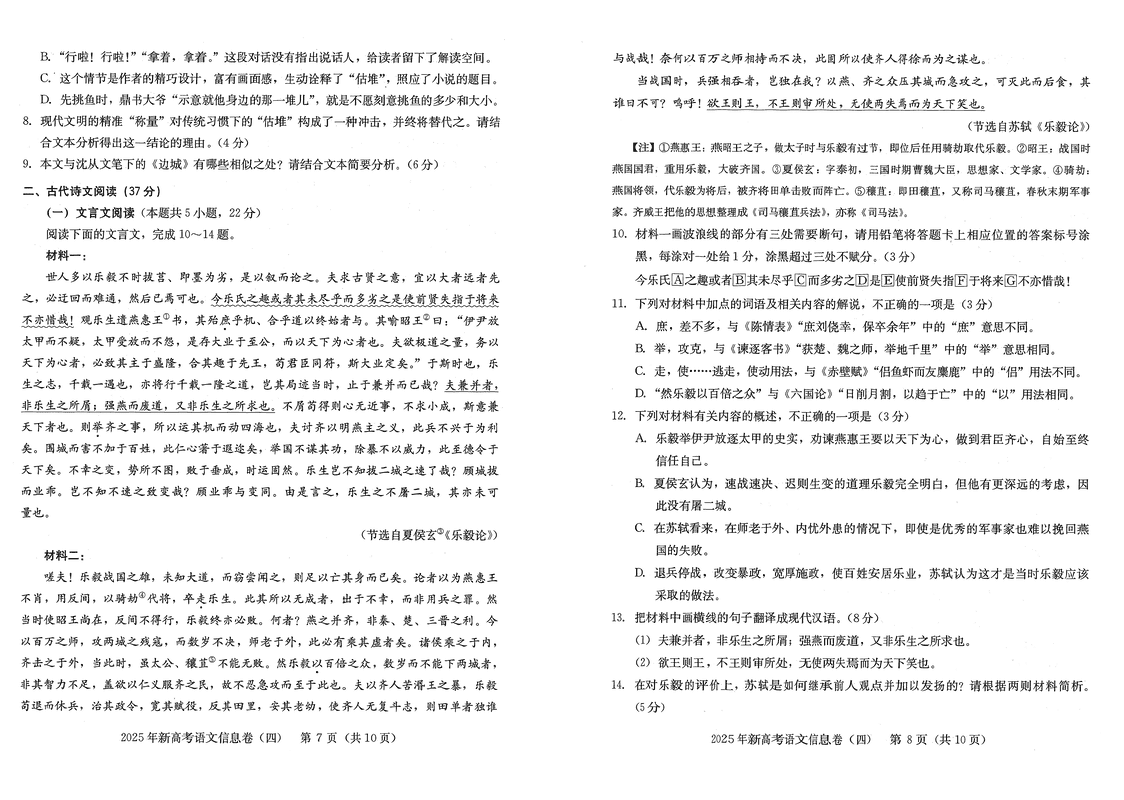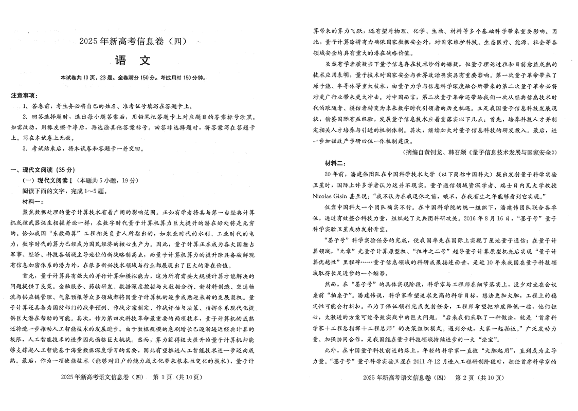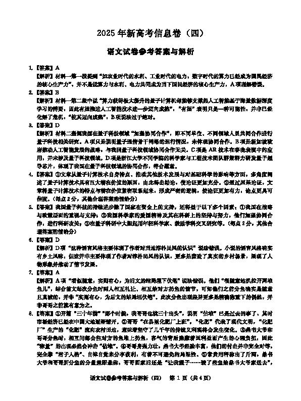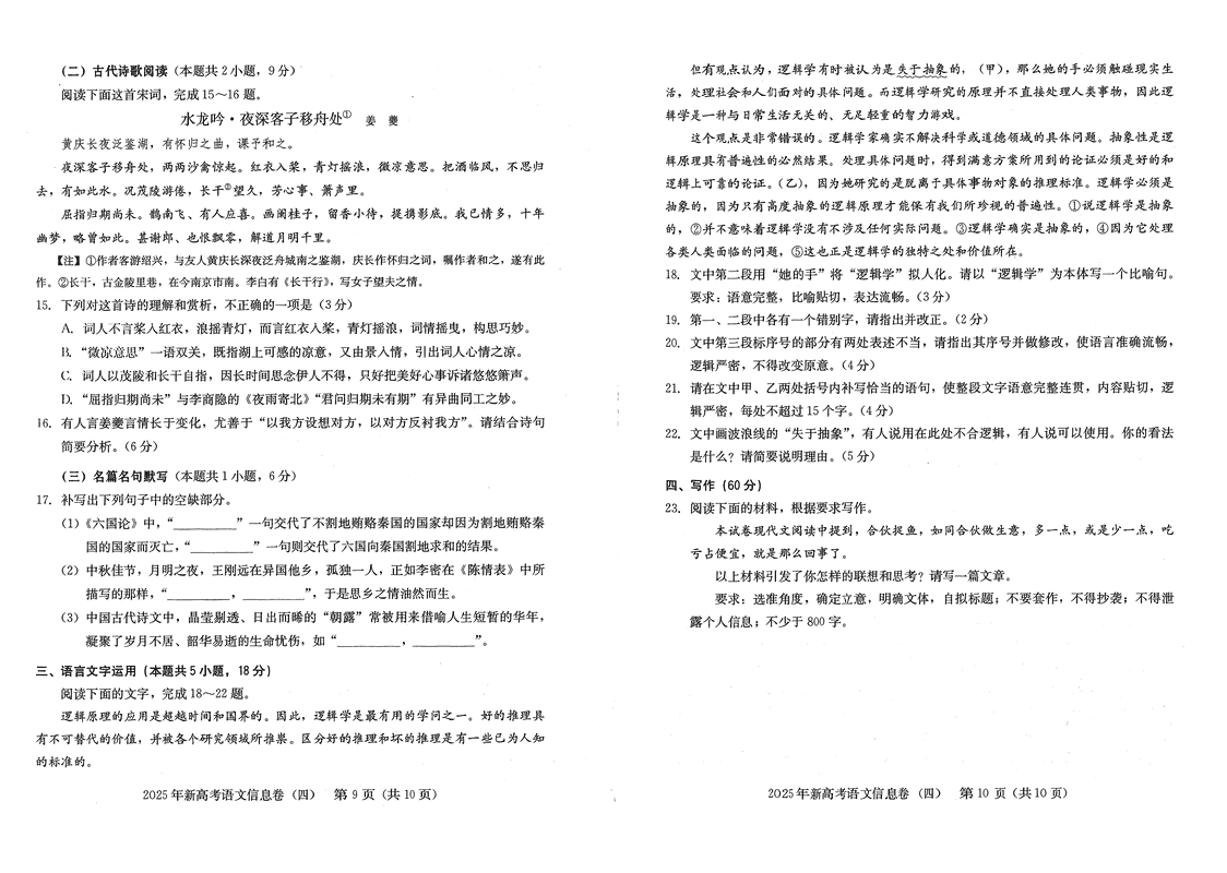 2025年湖北省新高考信息卷四语文试题及答案 时间:2025-05-19 湖北 语文试题 2025年湖北省新高考信息卷四语文考试已于近日开考,为方便考生考后及时查看考试情况,查漏补缺、弥补不足,本文整理了试题答案解析相关信息! 汇总:2025年湖北省新高考信息卷(四)试题及答案汇总 语文试题及答案解析