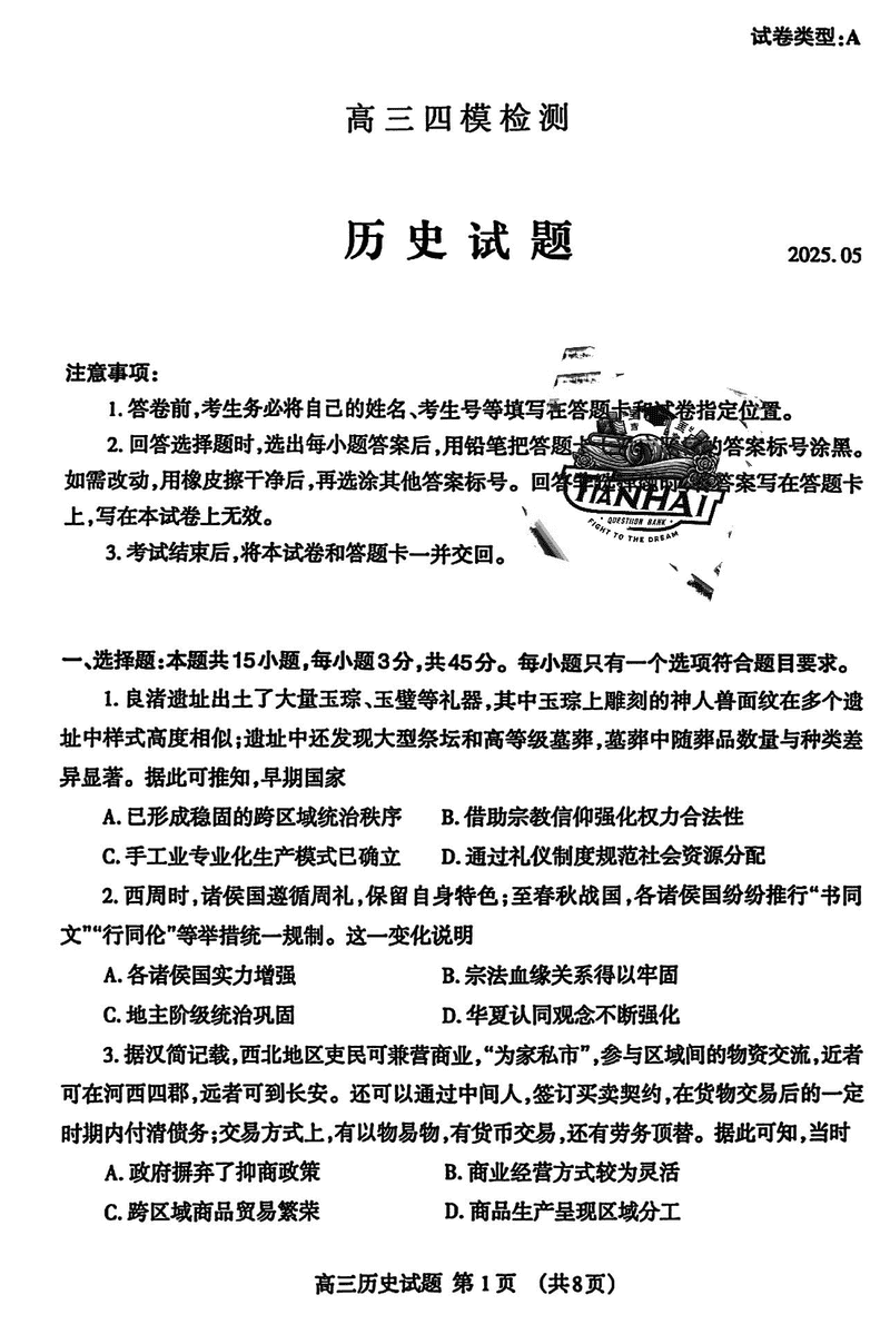 2025届山东泰安高三四模历史试题及答案 时间:2025-05-20 山东 文综试题 2025届山东省泰安高三四模历史考试已于近日开考,为方便考生考后及时查看考试情况,查漏补缺、弥补不足,本文整理了试题答案解析相关信息! 汇总:2025届山东省泰安高三四模检测试题及答案汇总 历史试题及答案解析