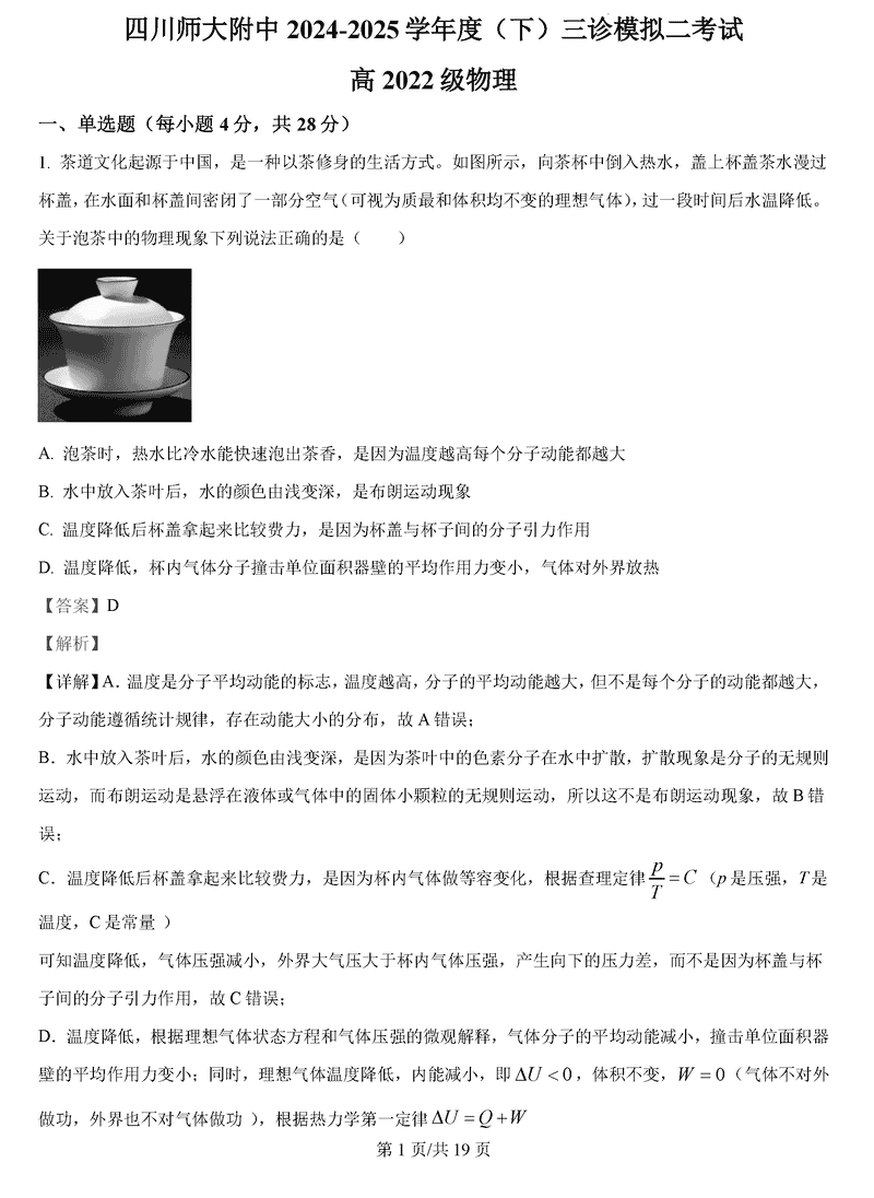 四川师大附中2025届高三下学期三诊模拟二物理考试已于近日开考,为方便考生考后及时查看考试情况,查漏补缺、弥补不足,本文整理了试题答案解析相关信息!