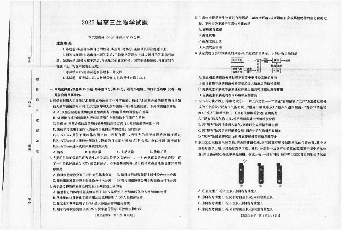 四川金太阳2025届高三5月联考生物试题及答案 时间:2025-05-20 四川 理综试题 四川金太阳2025届高三5月联考(25-507C)生物考试已于近日开考,为方便考生考后及时查看考试情况,查漏补缺、弥补不足,本文整理了试题答案解析相关信息! 汇总:四川金太阳2025届高三5月联考试题及答案汇总 生物试题及答案解析
