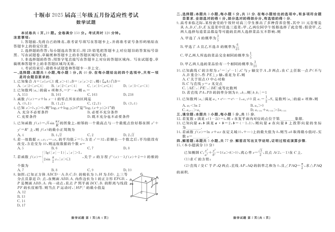 十堰市2025届高三下学期五月份适应性数学试题及答案