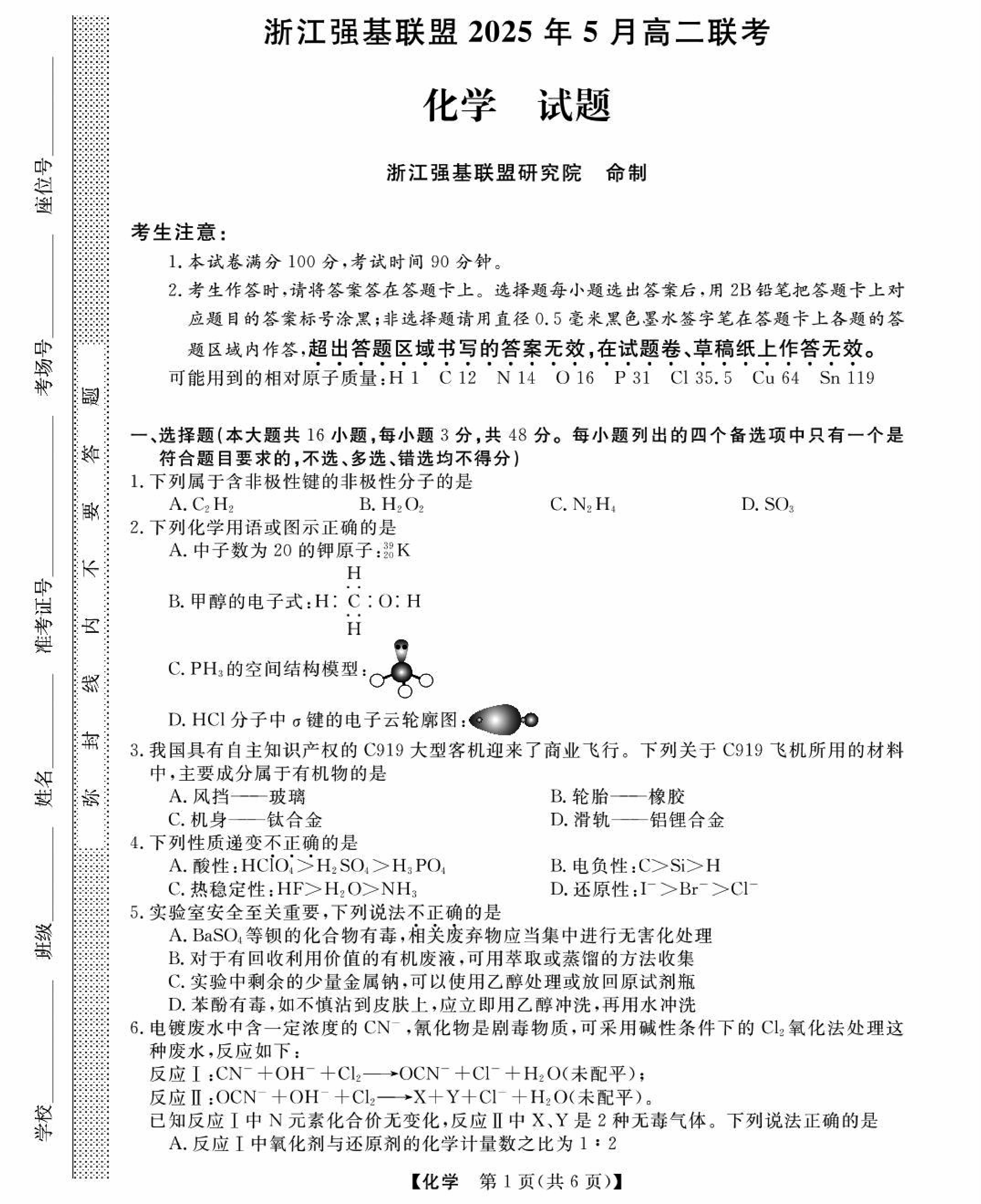 浙江强基联盟2024-2025学年高二下学期5月月考化学物理试题及答案 时间:2025-05-22 浙江 高中化学 浙江强基联盟2024-2025学年高二下学期5月月考化学考试已于近日开考,为方便考生考后及时查看考试情况,查漏补缺、弥补不足,本文整理了试题答案解析相关信息! 汇总: 化学试题及答案解析