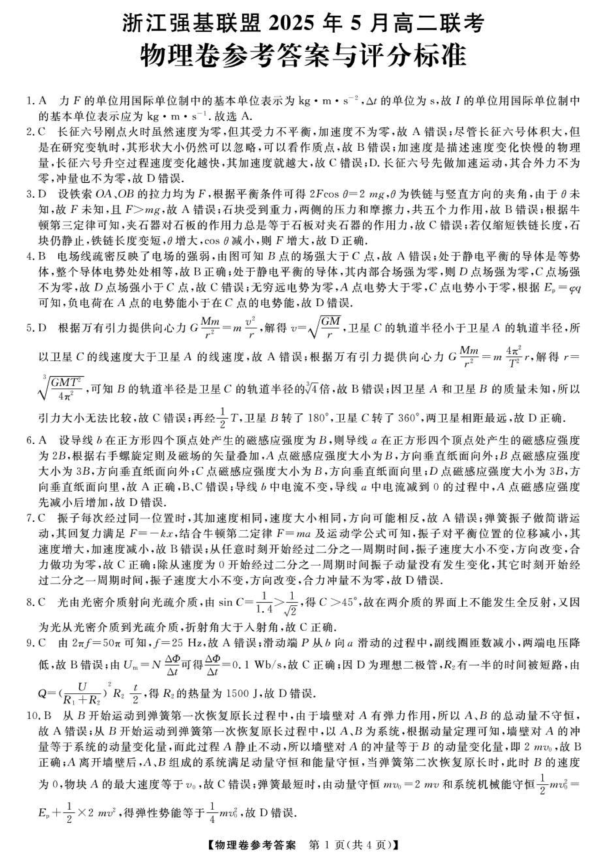 浙江强基联盟2025年5月高二联考物理试题及答案 时间:2025-05-22 浙江 高中物理 浙江强基联盟2025年5月高二联考物理考试已于近日开考,为方便考生考后及时查看考试情况,查漏补缺、弥补不足,本文整理了试题答案解析相关信息! 汇总: 物理试题及答案解析