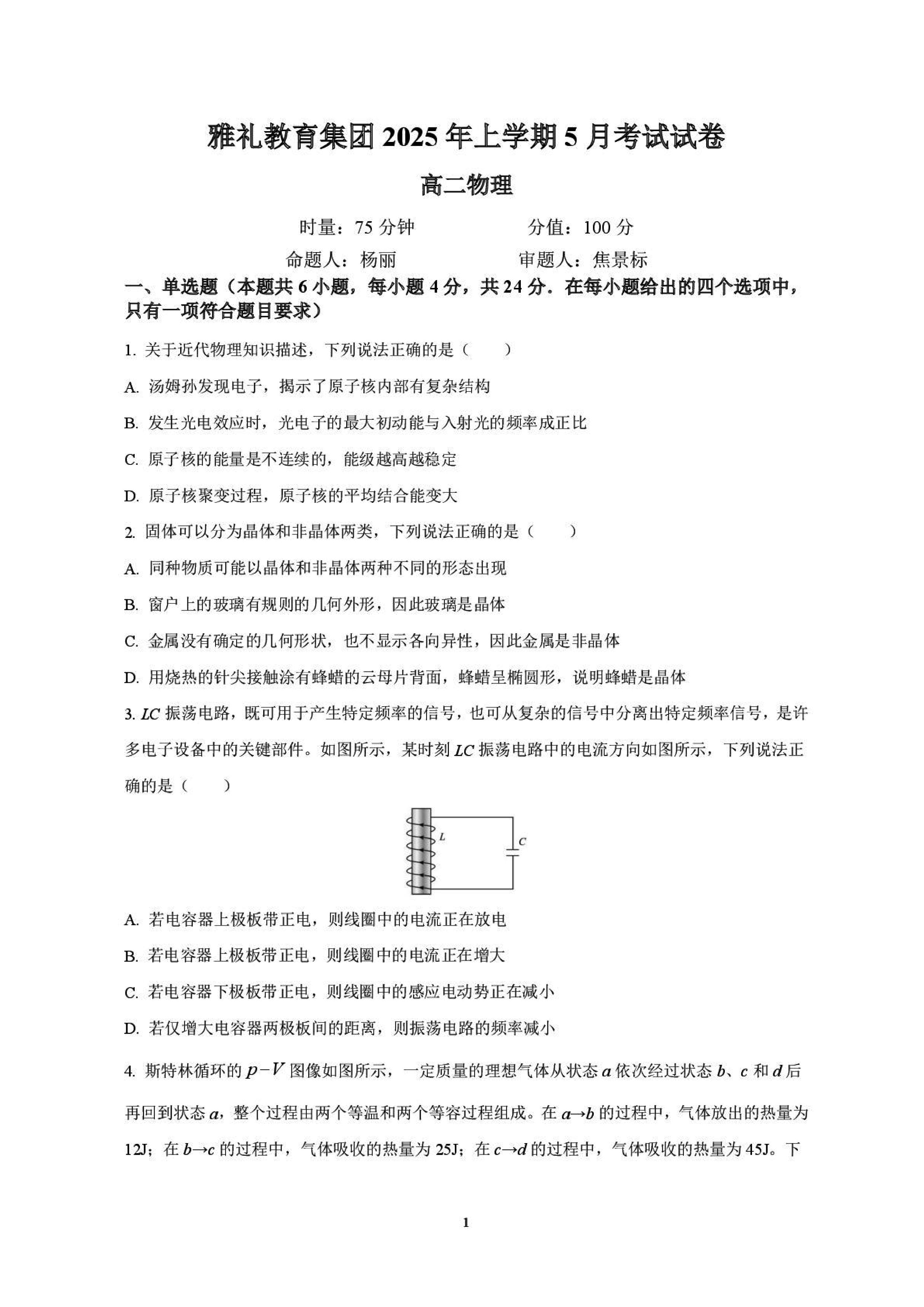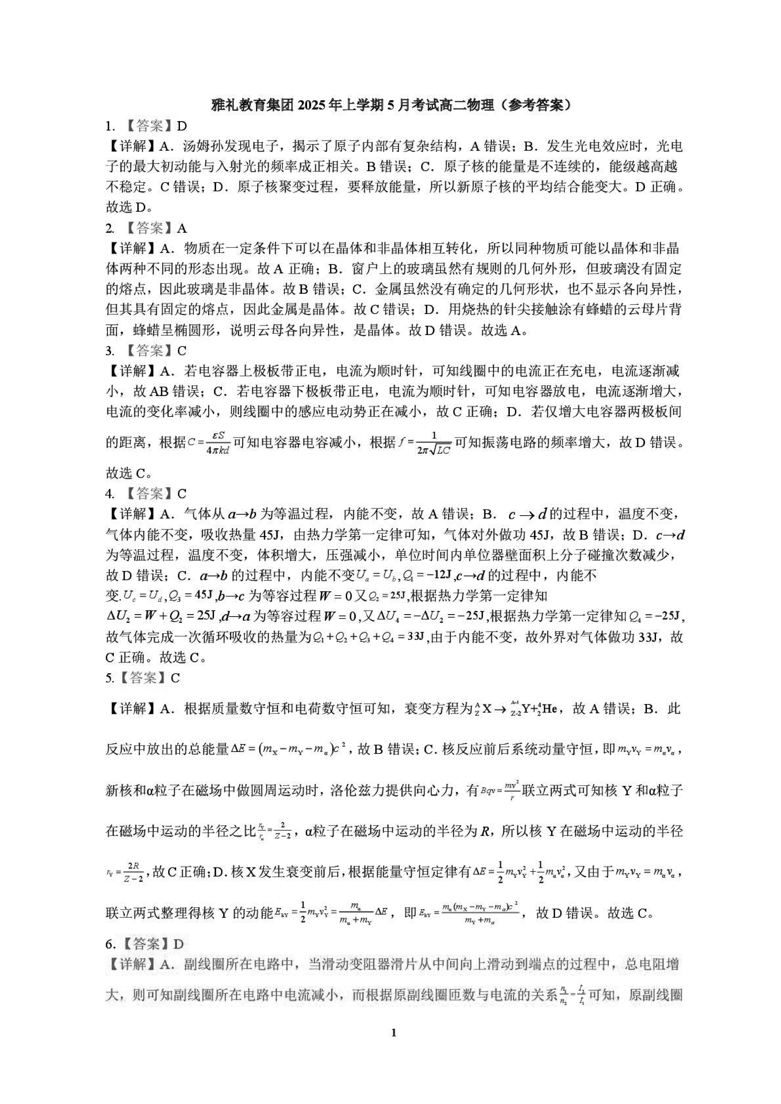 湖南雅礼中学2025年高二下学期5月月考物理试题及答案 时间:2025-05-22 湖南 高中物理 湖南雅礼中学2025年高二下学期5月月考物理考试已于近日开考,为方便考生考后及时查看考试情况,查漏补缺、弥补不足,本文整理了试题答案解析相关信息! 汇总: 物理试题及答案解析