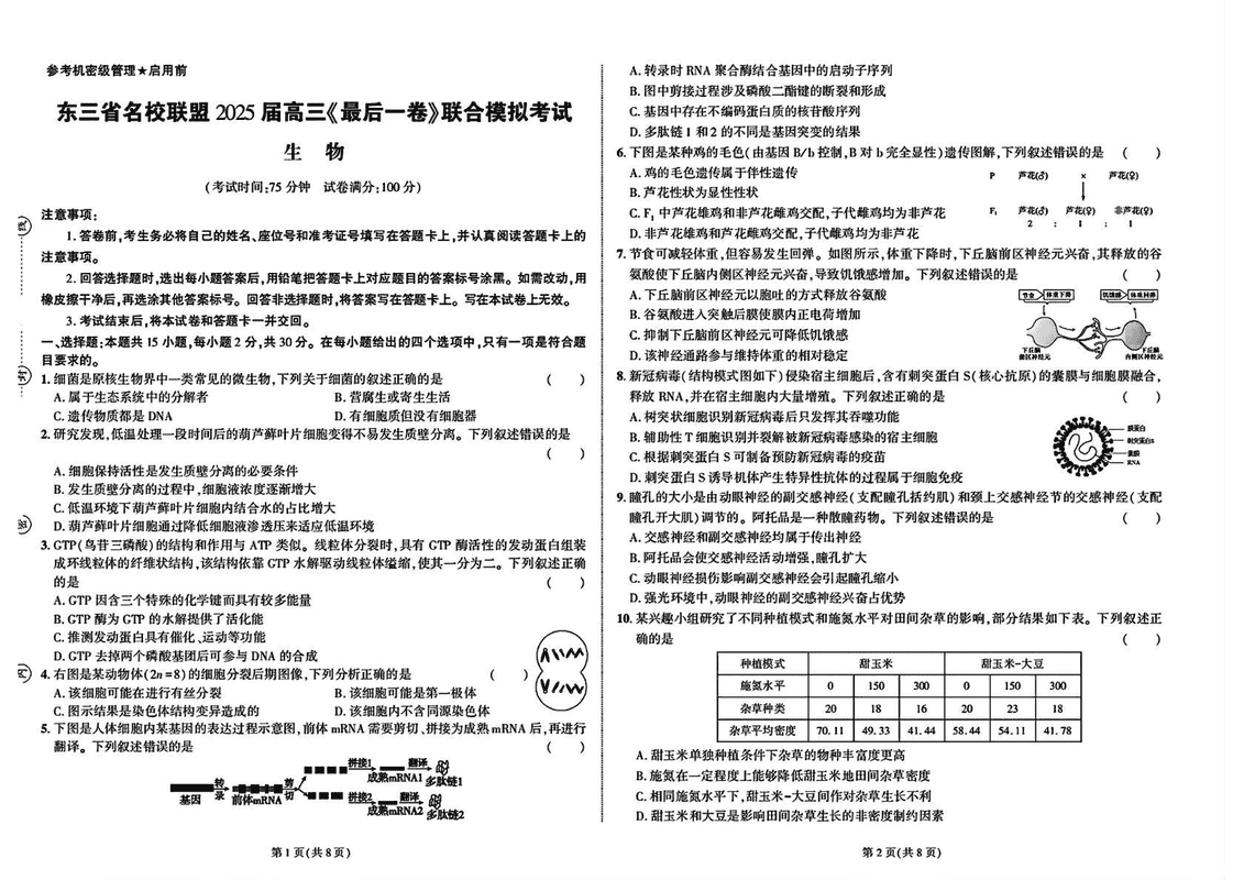 东三省名校联盟2025届高三最后一卷联考生物试题及答案