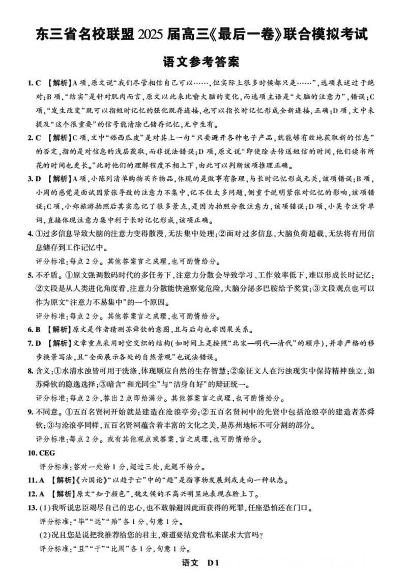 东三省名校联盟2025届高三最后一卷联考语文考试已于近日开考,为方便考生考后及时查看考试情况,查漏补缺、弥补不足,本文整理了试题答案解析相关信息!