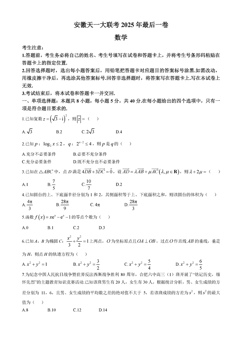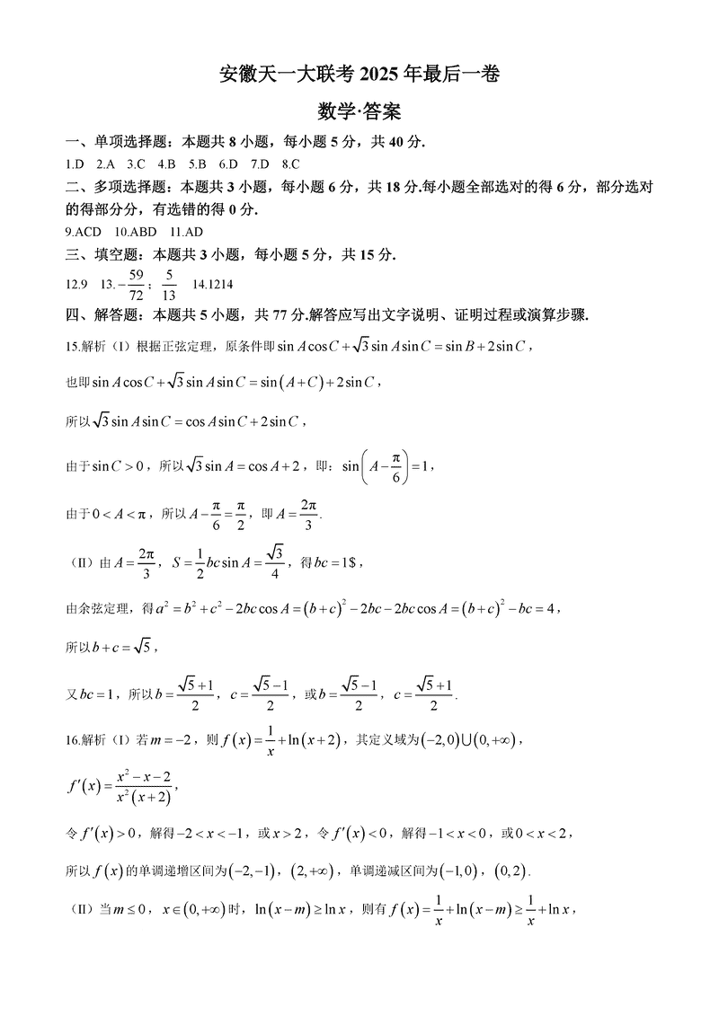 安徽天一大联考2025届高三最后一卷数学试题及答案
