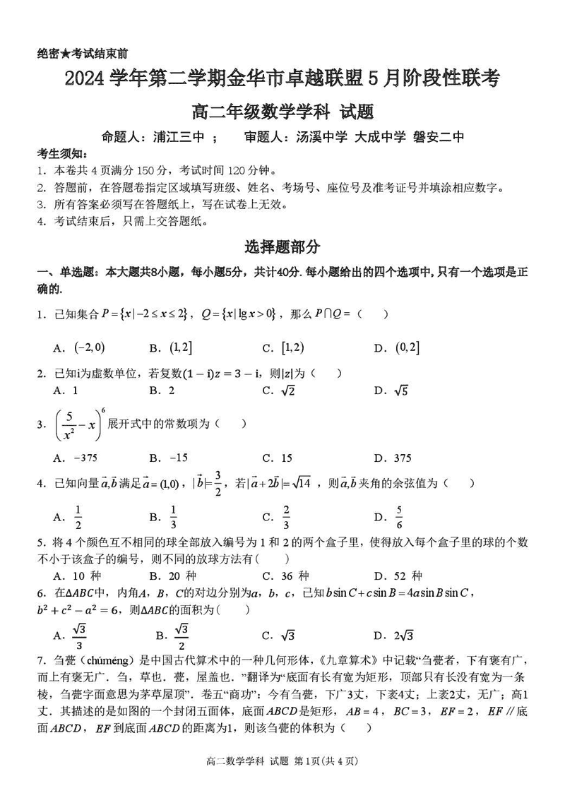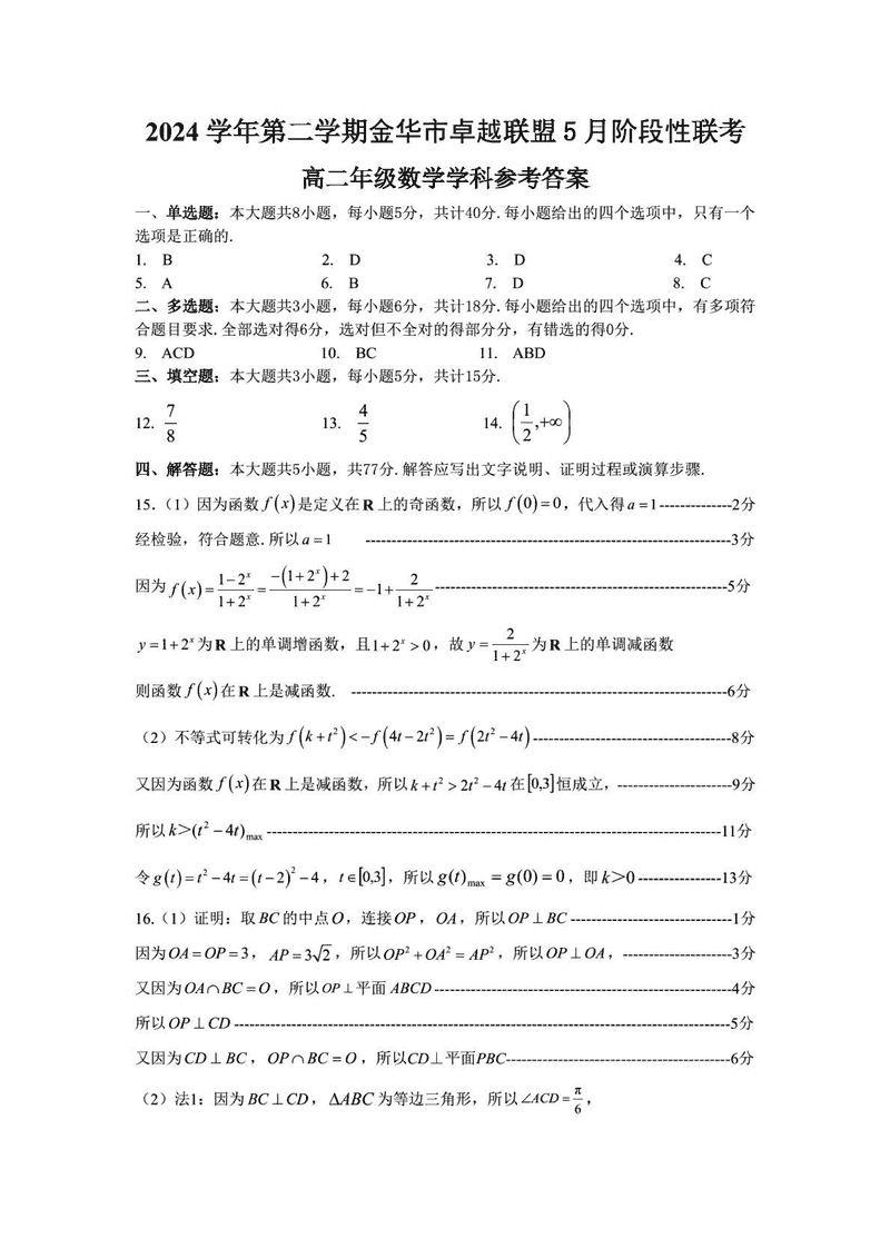 浙江卓越联盟2025年高二下学期5月联考数学试题及答案 时间:2025-05-24 浙江 高中数学 浙江卓越联盟2025年高二下学期5月联考数学考试已于近日开考,为方便考生考后及时查看考试情况,查漏补缺、弥补不足,本文整理了试题答案解析相关信息! 数学试题及答案解析