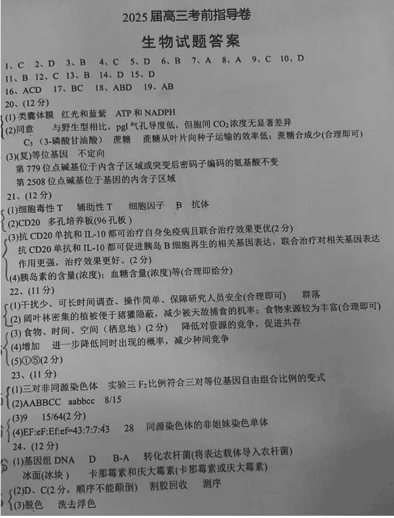 2025届江苏盐城高三下学期考前指导卷生物考试已于近日开考,为方便考生考后及时查看考试情况,查漏补缺、弥补不足,本文整理了试题答案解析相关信息!