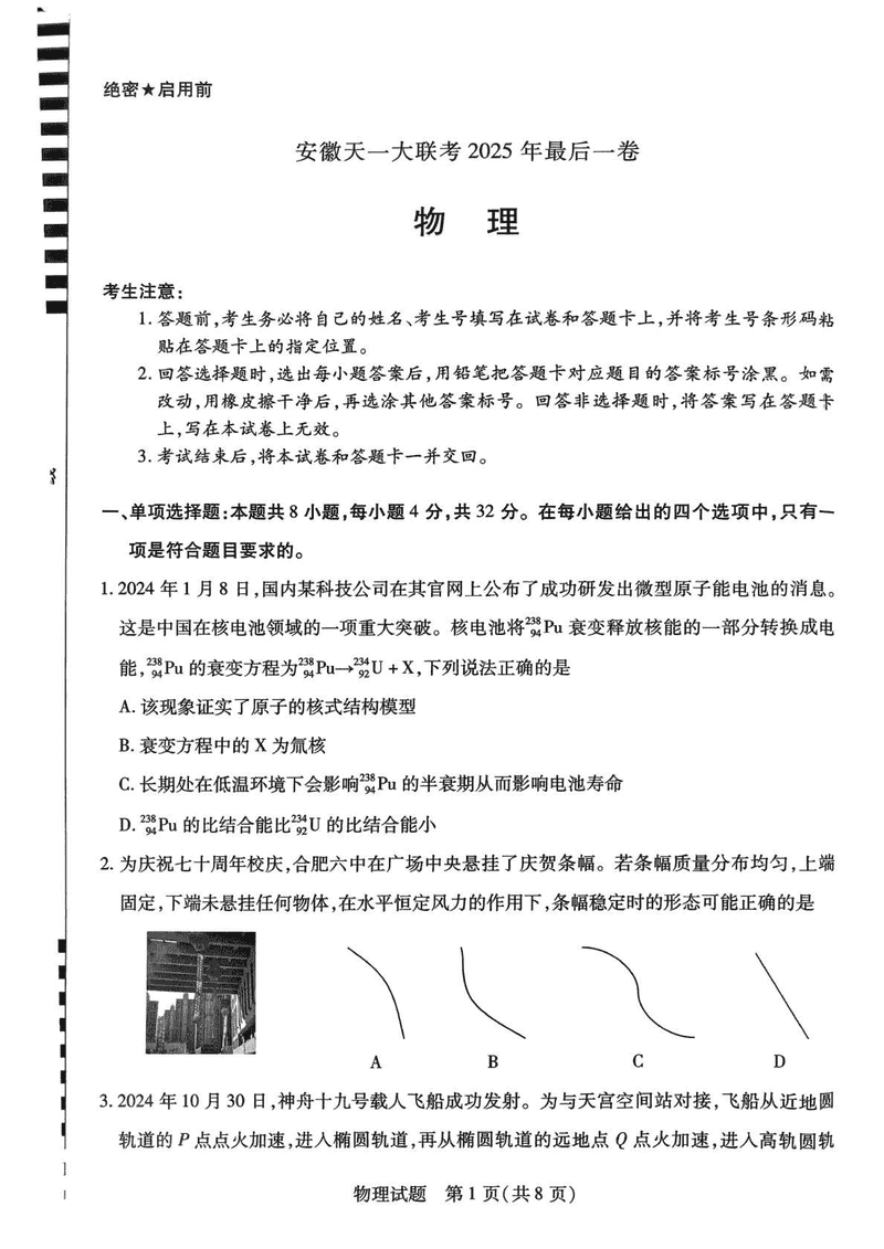 安徽天一大联考2025届高三最后一卷物理考试已于近日开考,为方便考生考后及时查看考试情况,查漏补缺、弥补不足,本文整理了试题答案解析相关信息!