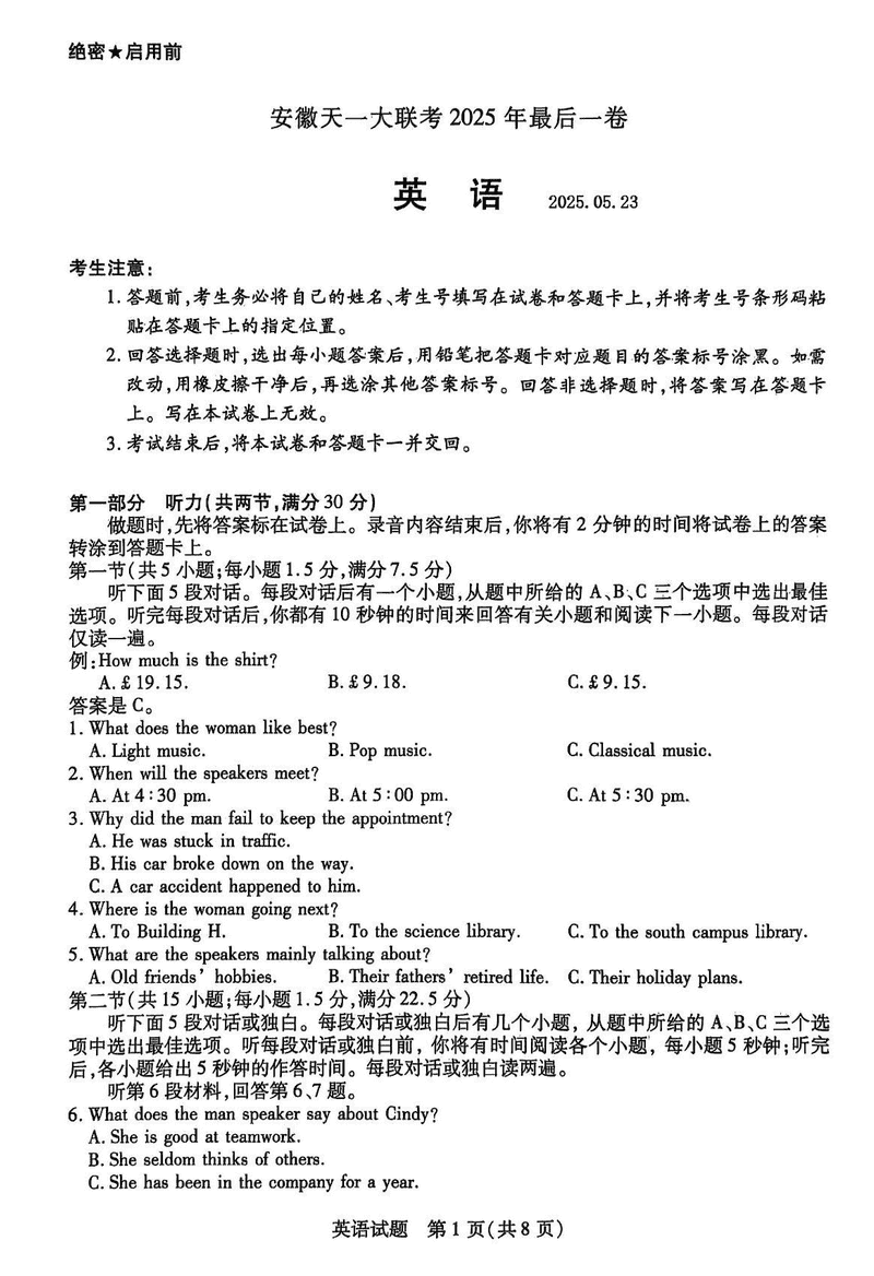安徽天一大联考2025届高三最后一卷英语考试已于近日开考,为方便考生考后及时查看考试情况,查漏补缺、弥补不足,本文整理了试题答案解析相关信息!