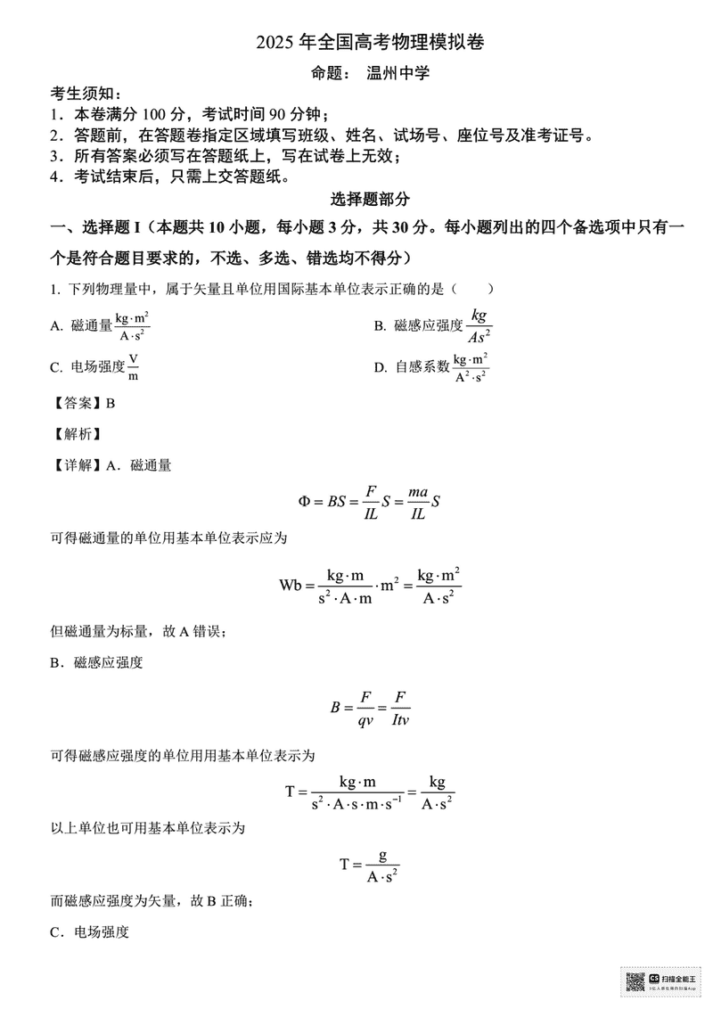 浙江省六校(杭二/温中金华一中/绍兴一中/舟山中学/衢州二中)联考2025届高三5月高考模拟物理考试已于近日开考,为方便考生考后及时查看考试情况,查漏补缺、弥补不足,本文整理了试题答案解析相关信息!