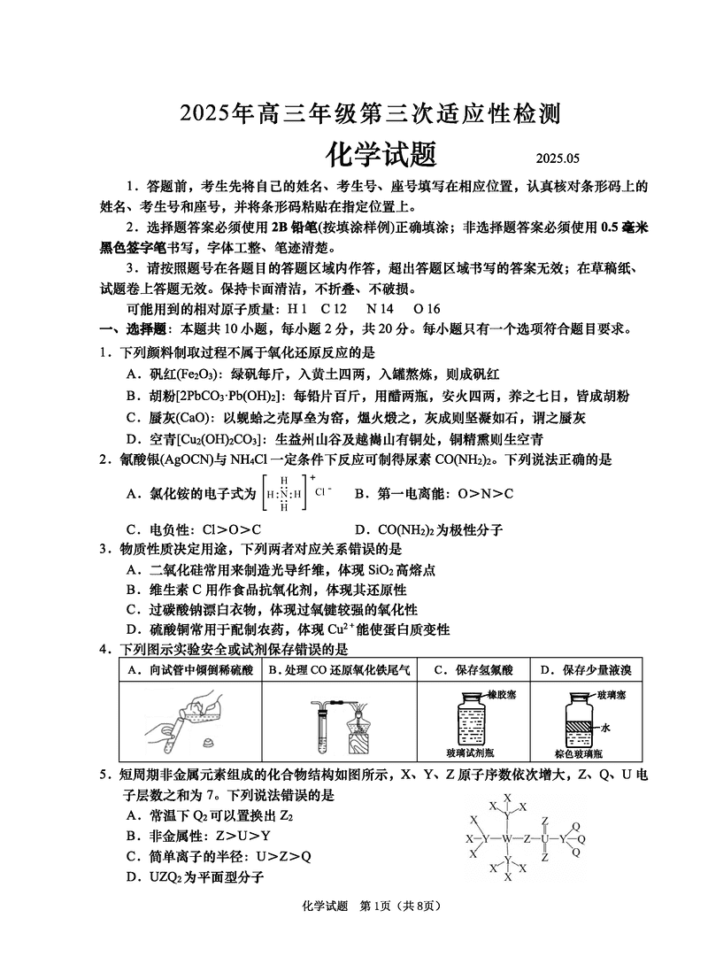 青岛三模2025年高三第三次适应性检测化学试题及答案
