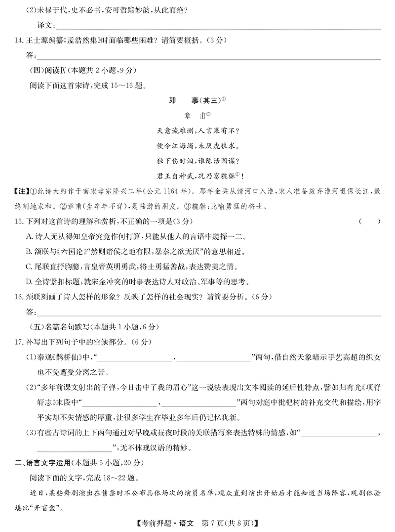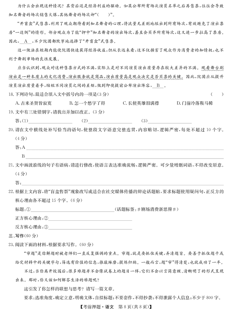 安徽九师联盟2025届高三5月考前押题语文考试已于近日开考,为方便考生考后及时查看考试情况,查漏补缺、弥补不足,本文整理了试题答案解析相关信息!