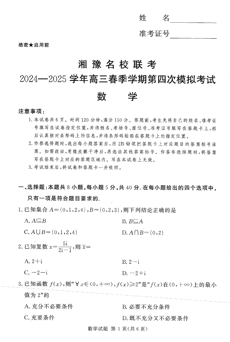 湘豫名校联考2024-2025学年高三下学期第四次模拟数学考试已于近日开考,为方便考生考后及时查看考试情况,查漏补缺、弥补不足,本文整理了试题答案解析相关信息!