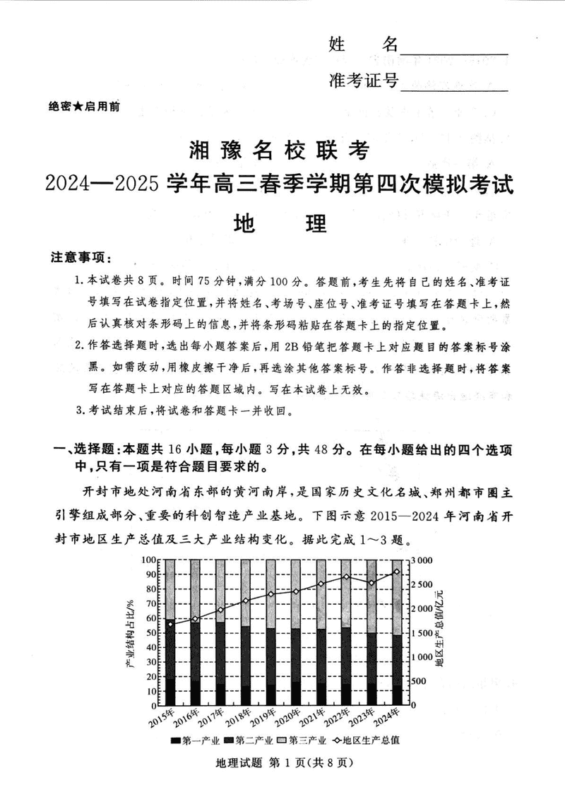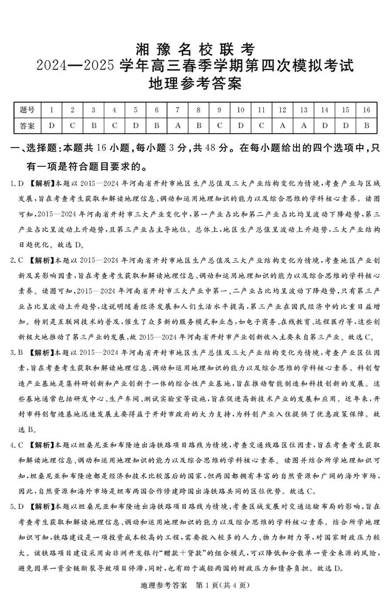 湘豫名校联考2024-2025学年高三下学期第四次模拟地理考试已于近日开考,为方便考生考后及时查看考试情况,查漏补缺、弥补不足,本文整理了试题答案解析相关信息!