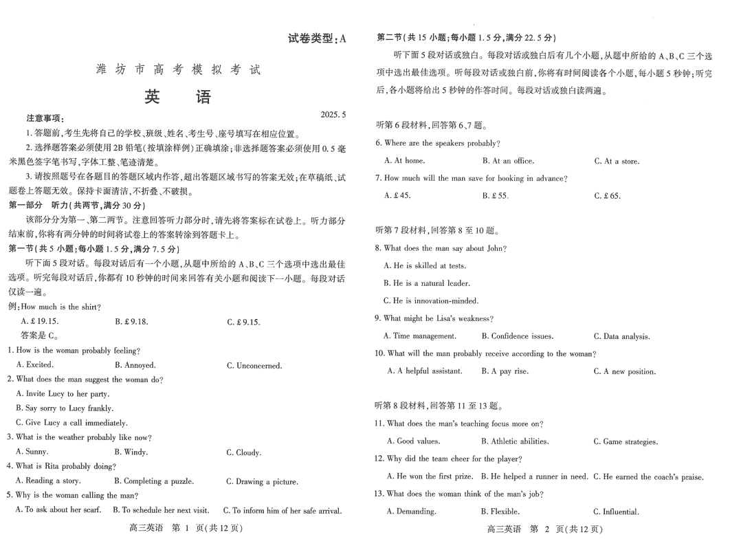 潍坊三模2025届高考模拟英语试题及答案 时间:2025-05-30 山东 英语试题 山东省潍坊三模2025届高考模拟英语考试已于近日开考,为方便考生考后及时查看考试情况,查漏补缺、弥补不足,本文整理了试题答案解析相关信息! 汇总:山东省潍坊三模2025届高考模拟考试试题及答案汇总 英语试题及答案解析