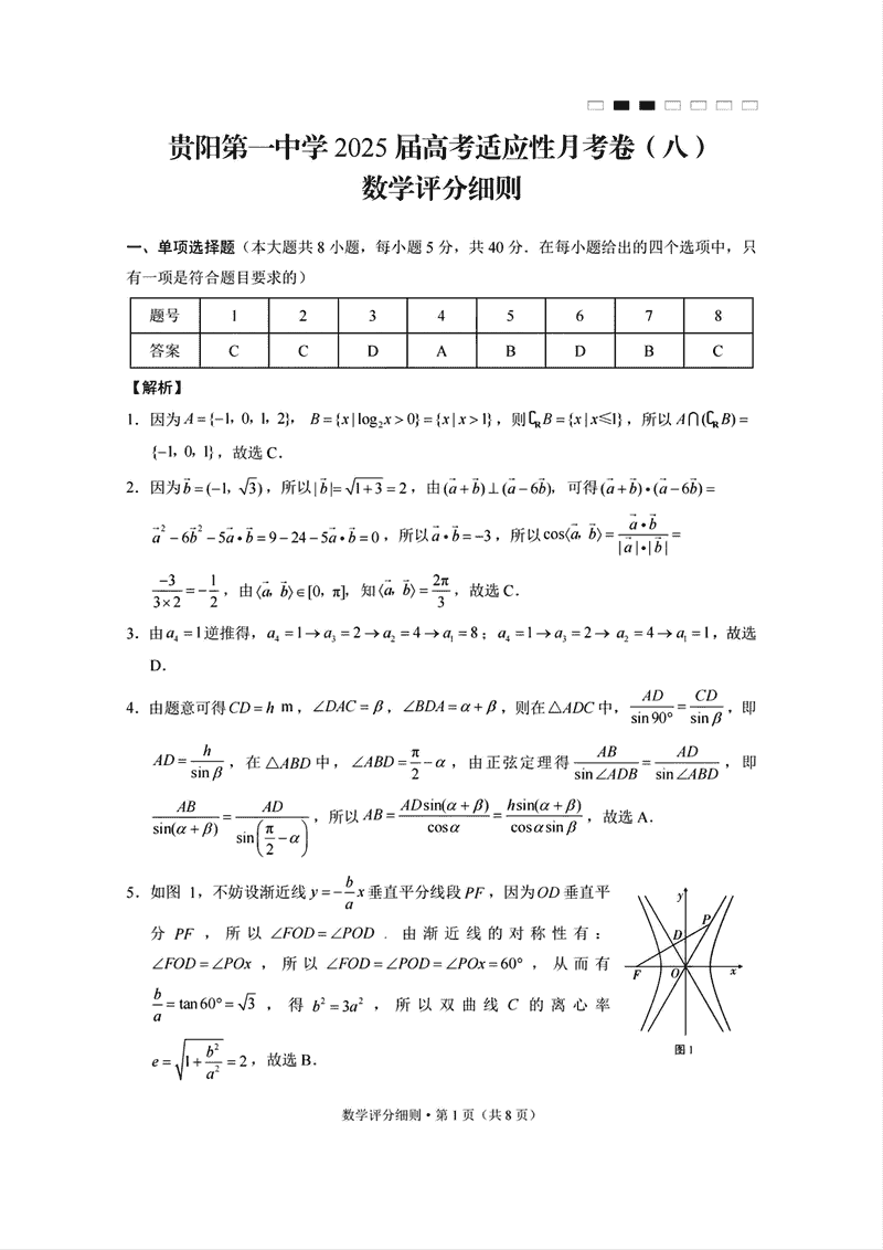 贵阳一中2025届高考适应性月考卷(八)数学试题及答案