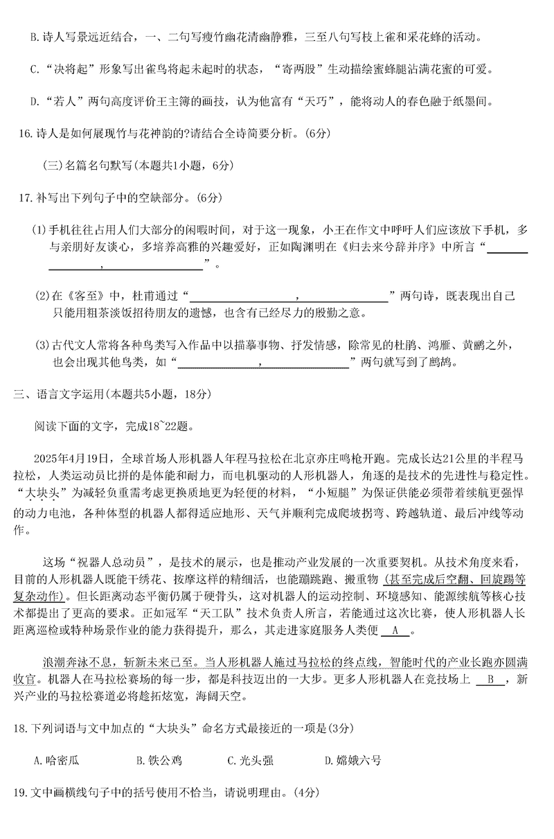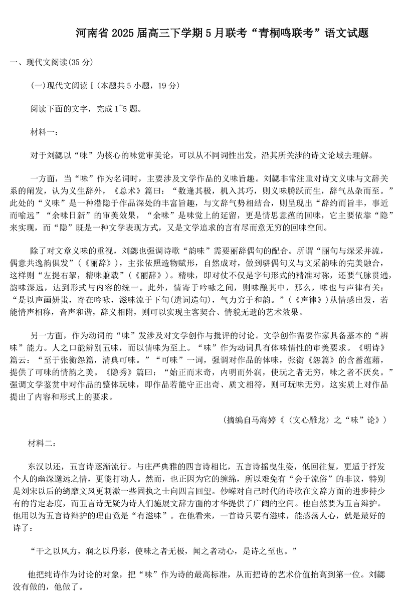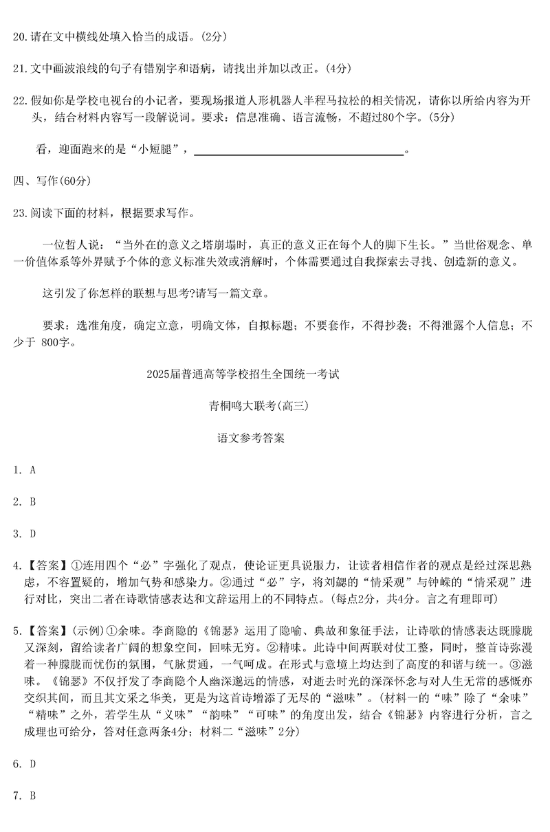 2025届河南青桐鸣5月全真模拟卷语文试题及答案 时间:2025-05-30 河南 语文试题 2025届河南省青桐鸣5月全真模拟卷语文考试已于近日开考,为方便考生考后及时查看考试情况,查漏补缺、弥补不足,本文整理了试题答案解析相关信息! 汇总:2025届河南省青桐鸣5月全真模拟卷试题及答案汇总 语文试题及答案解析