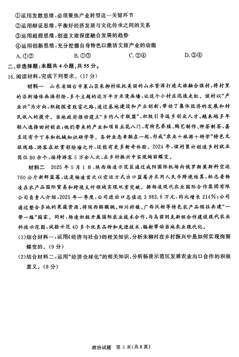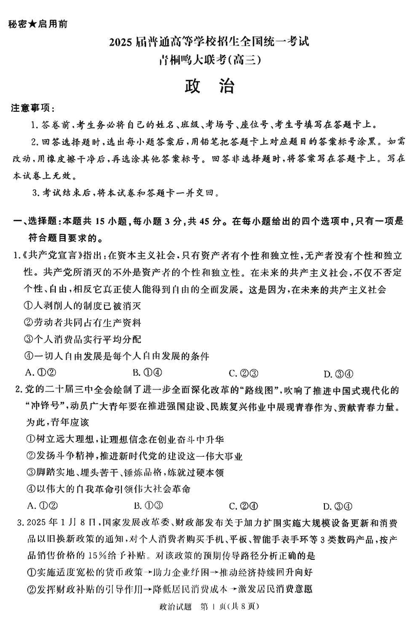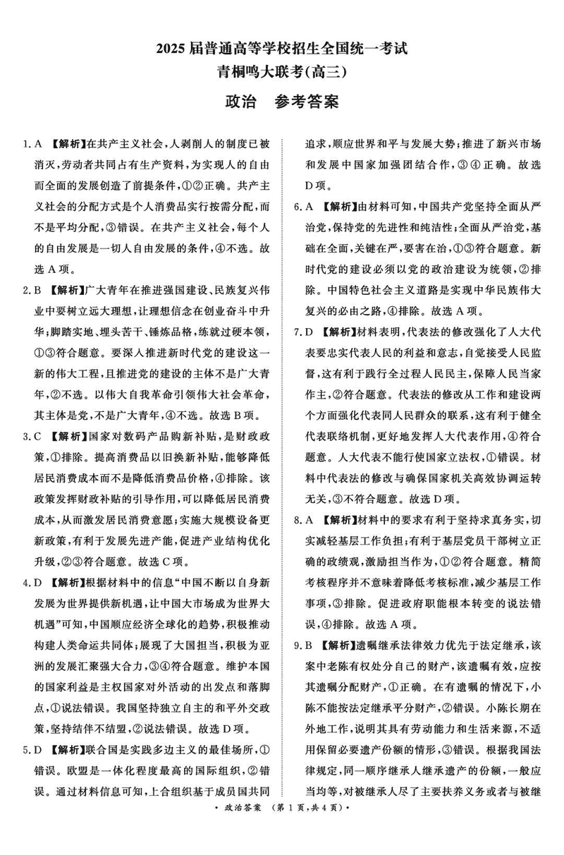 2025届河南青桐鸣5月全真模拟卷政治试题及答案 时间:2025-05-30 河南 文综试题 2025届河南省青桐鸣5月全真模拟卷政治考试已于近日开考,为方便考生考后及时查看考试情况,查漏补缺、弥补不足,本文整理了试题答案解析相关信息! 汇总:2025届河南省青桐鸣5月全真模拟卷试题及答案汇总 政治试题及答案解析