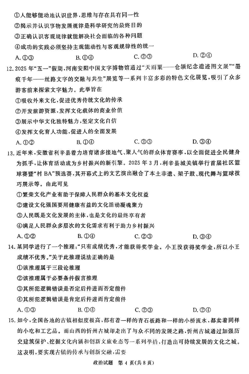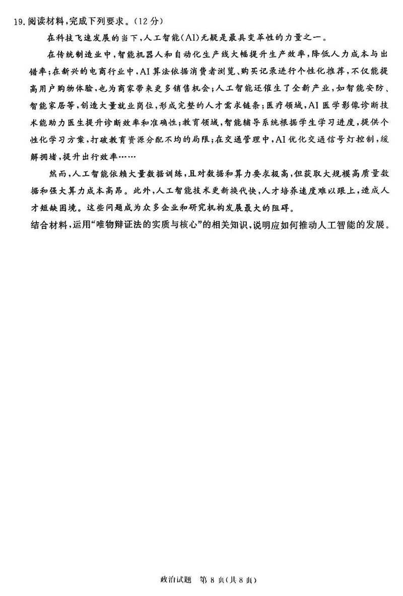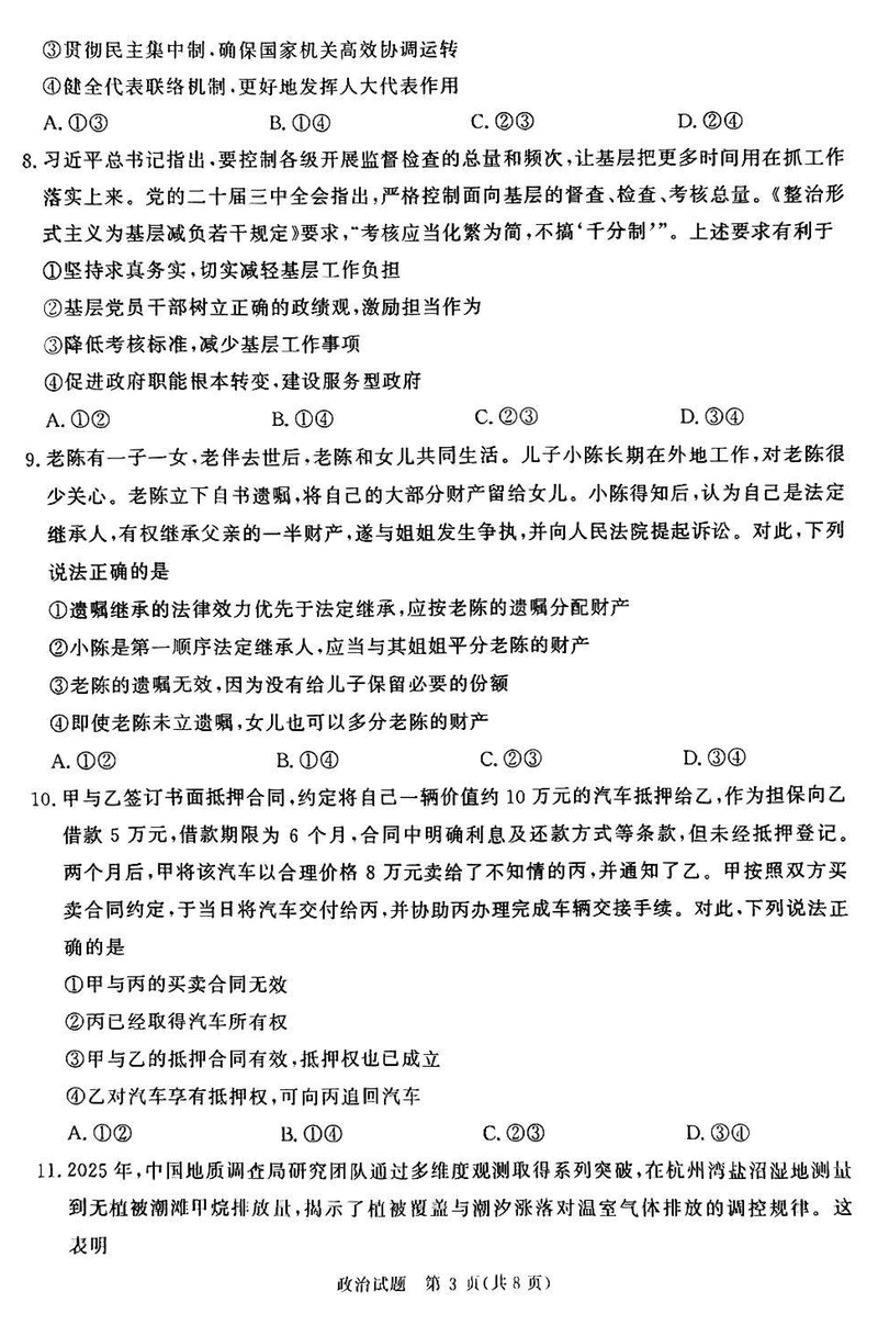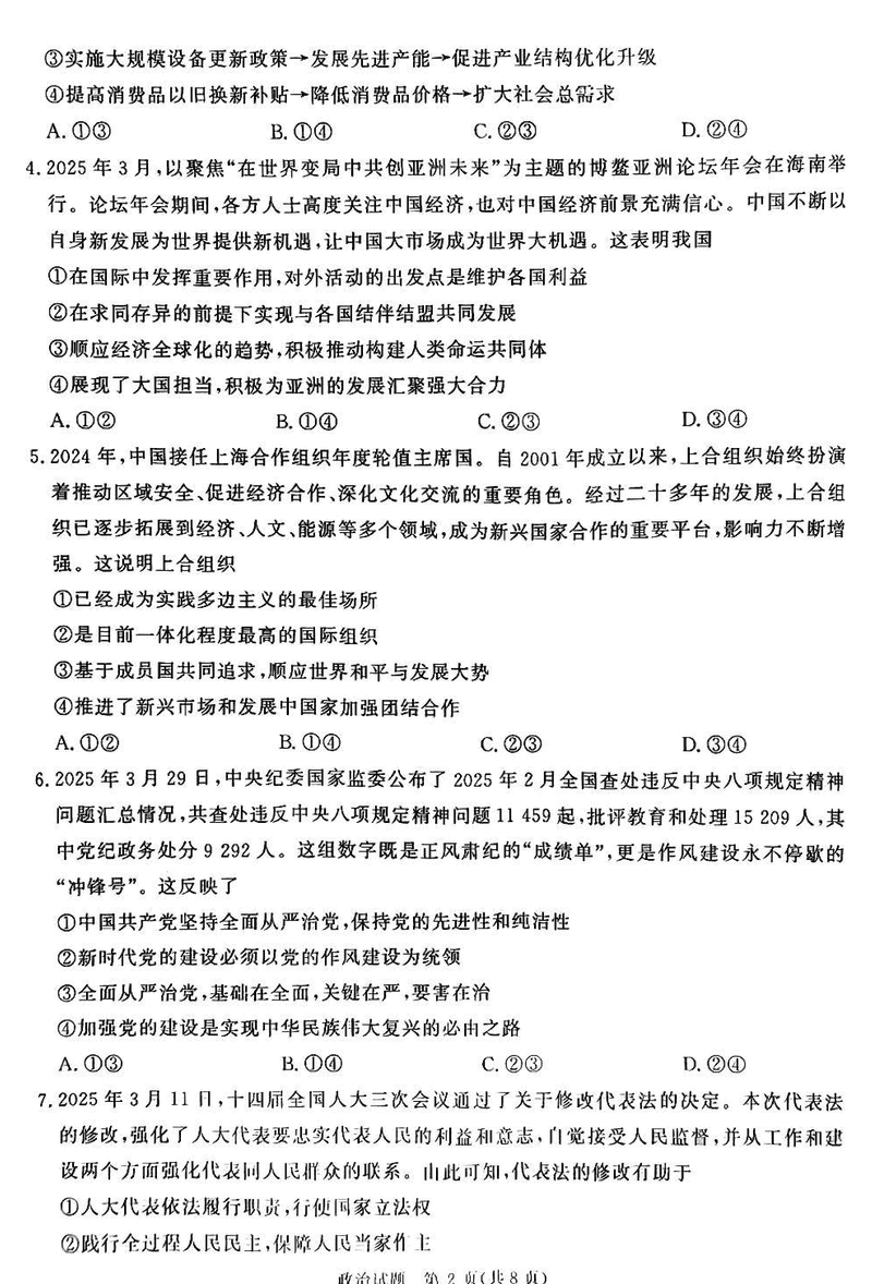 2025届河南青桐鸣5月全真模拟卷政治试题及答案 时间:2025-05-30 河南 文综试题 2025届河南省青桐鸣5月全真模拟卷政治考试已于近日开考,为方便考生考后及时查看考试情况,查漏补缺、弥补不足,本文整理了试题答案解析相关信息! 汇总:2025届河南省青桐鸣5月全真模拟卷试题及答案汇总 政治试题及答案解析