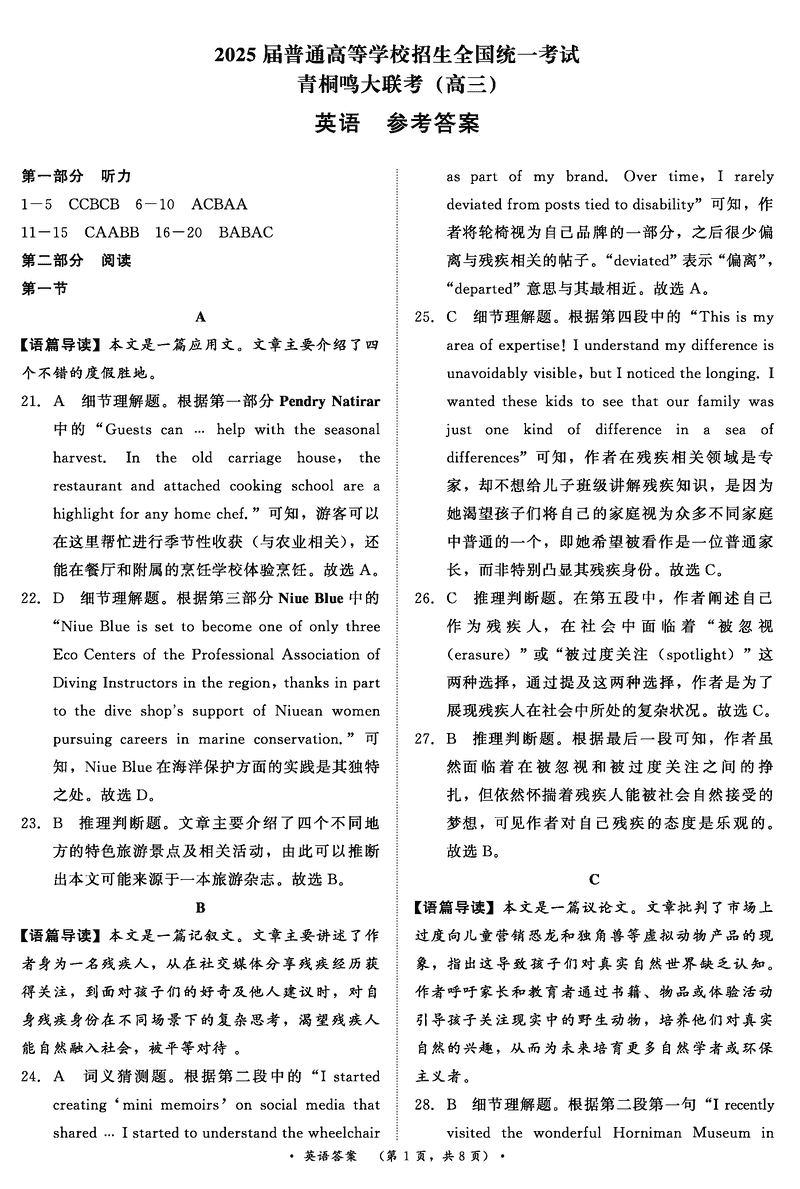 2025届河南青桐鸣5月全真模拟卷英语试题及答案 时间:2025-05-30 河南 英语试题 2025届河南省青桐鸣5月全真模拟卷英语考试已于近日开考,为方便考生考后及时查看考试情况,查漏补缺、弥补不足,本文整理了试题答案解析相关信息! 汇总:2025届河南省青桐鸣5月全真模拟卷试题及答案汇总 英语试题及答案解析