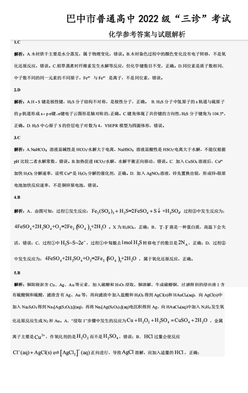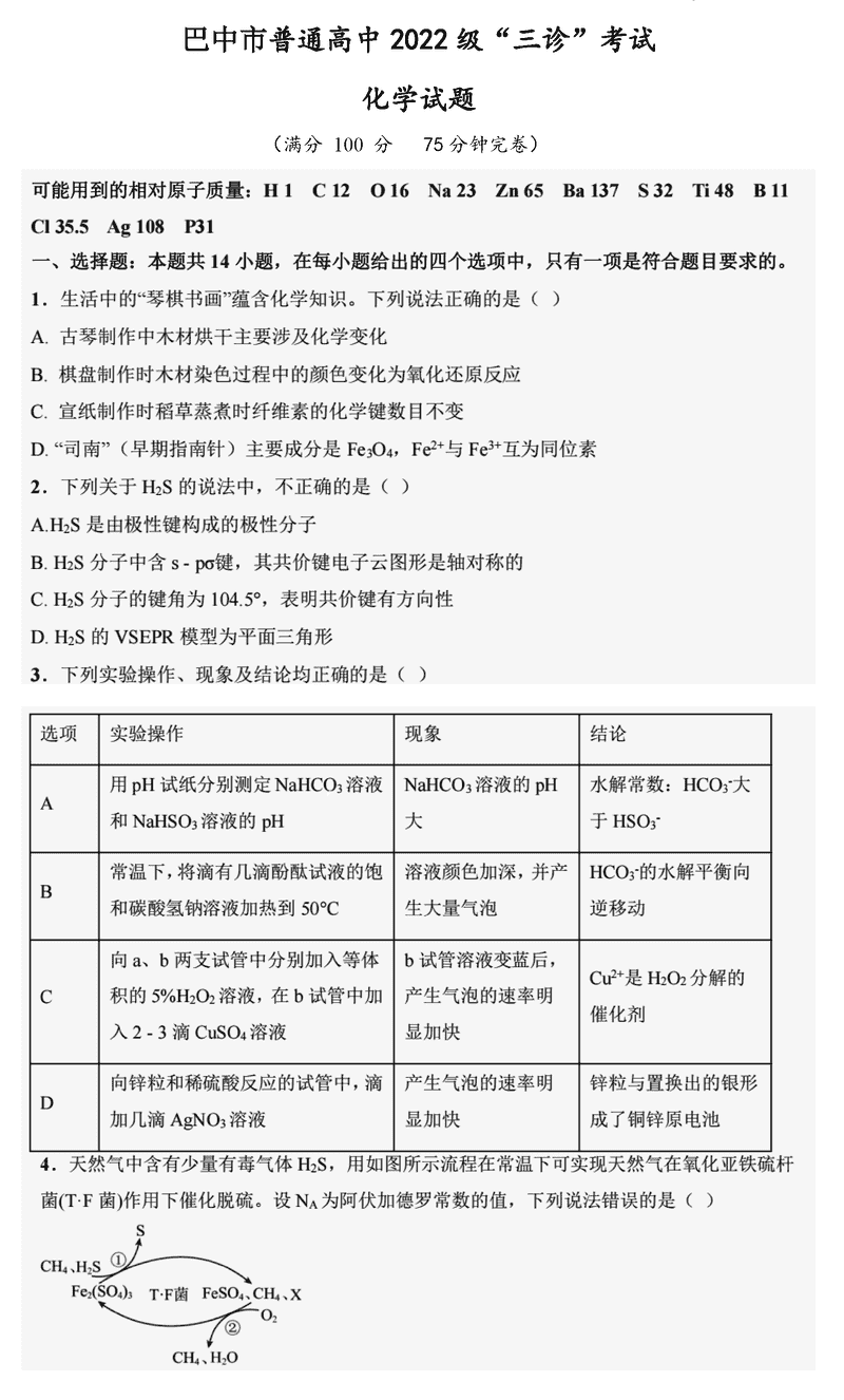 巴中市普通高中2025届“三诊”化学试题及答案 时间:2025-06-01 四川 理综试题 巴中市普通高中2025届“三诊”化学考试已于近日开考,为方便考生考后及时查看考试情况,查漏补缺、弥补不足,本文整理了试题答案解析相关信息! 汇总:巴中市普通高中2025届“三诊”考试试题及答案汇总 化学试题及答案解析