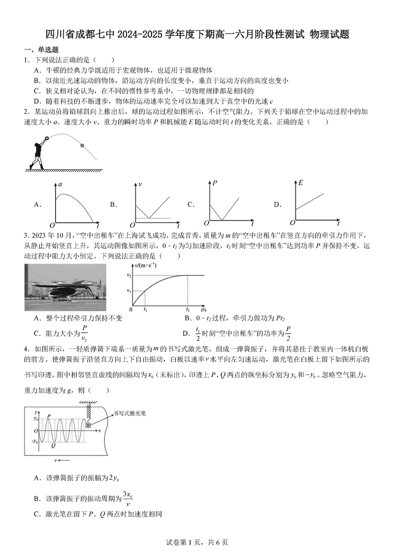 成都七中2025年高一六月阶段性测试物理试题及答案 时间:2025-06-10 四川 高中物理 成都七中2025年高一六月阶段性测试物理考试已于近日开考,为方便考生考后及时查看考试情况,查漏补缺、弥补不足,本文整理了试题答案解析相关信息! 汇总: 物理试题及答案解析