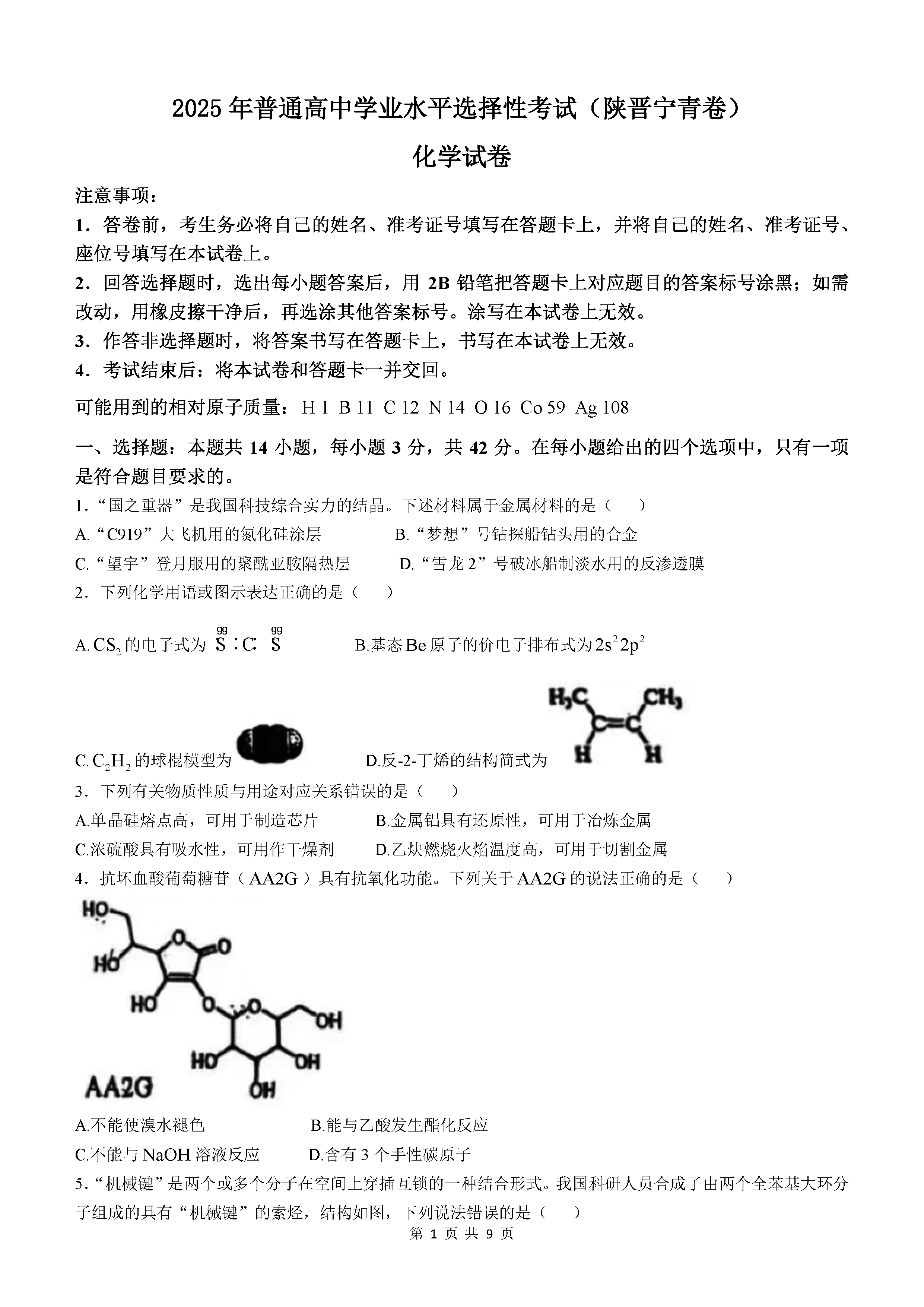 2025年陕西青海山西宁夏四省高考化学试题及答案解析