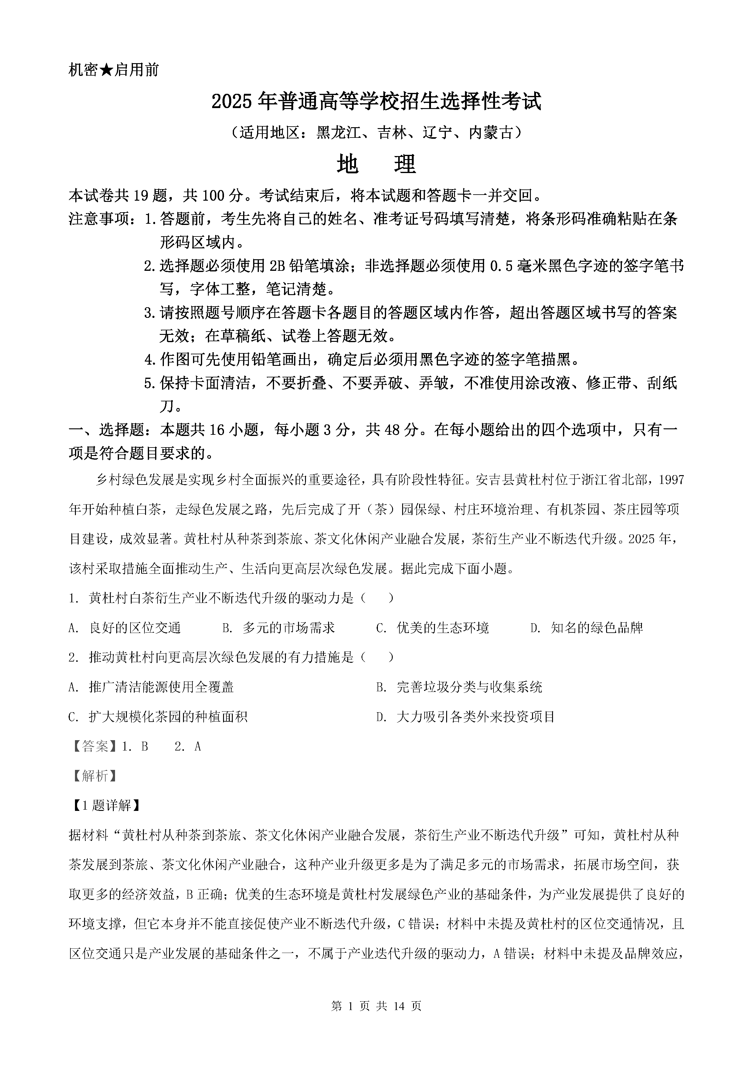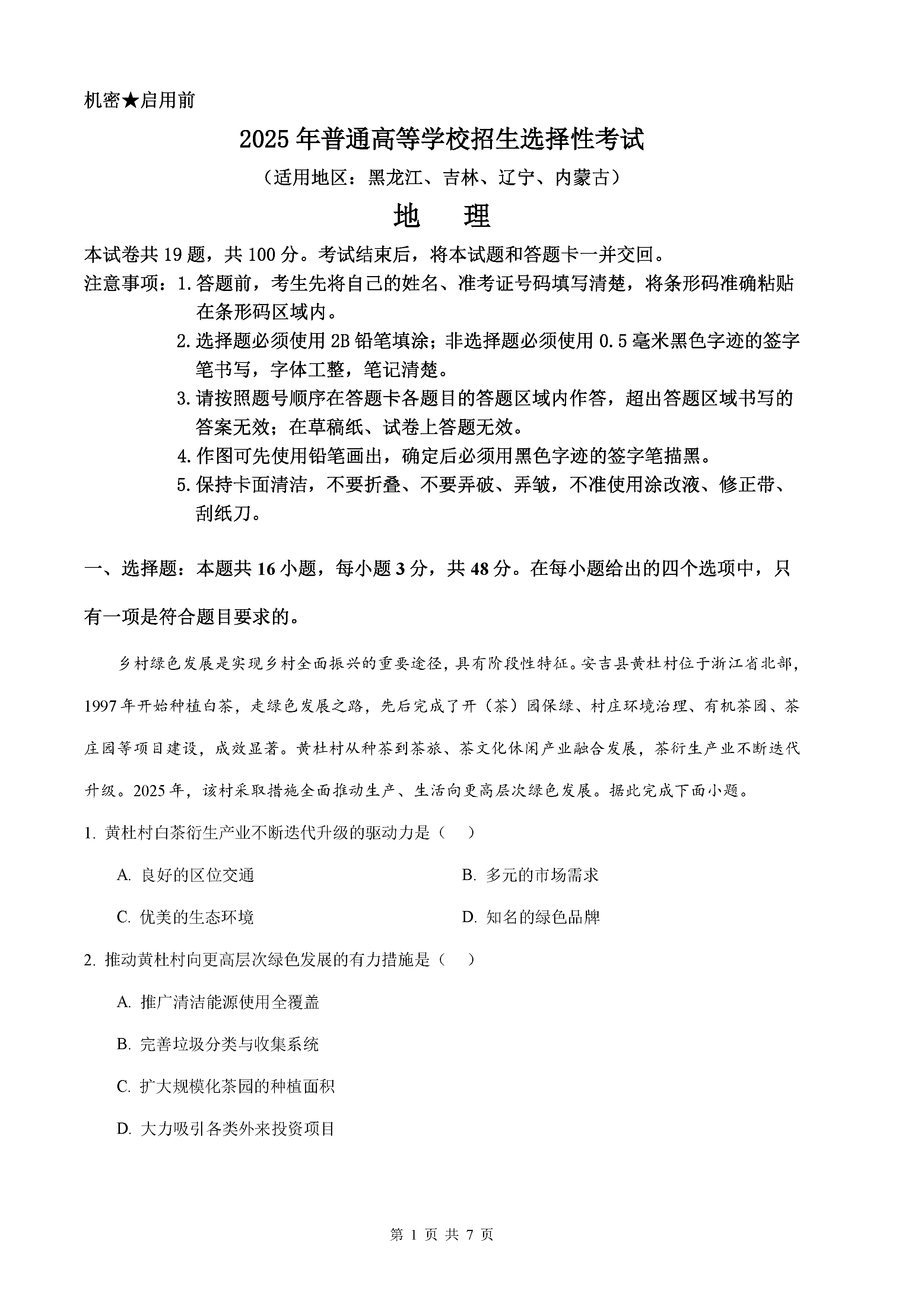 2025年黑龙江吉林辽宁内蒙高考地理试题及答案解析