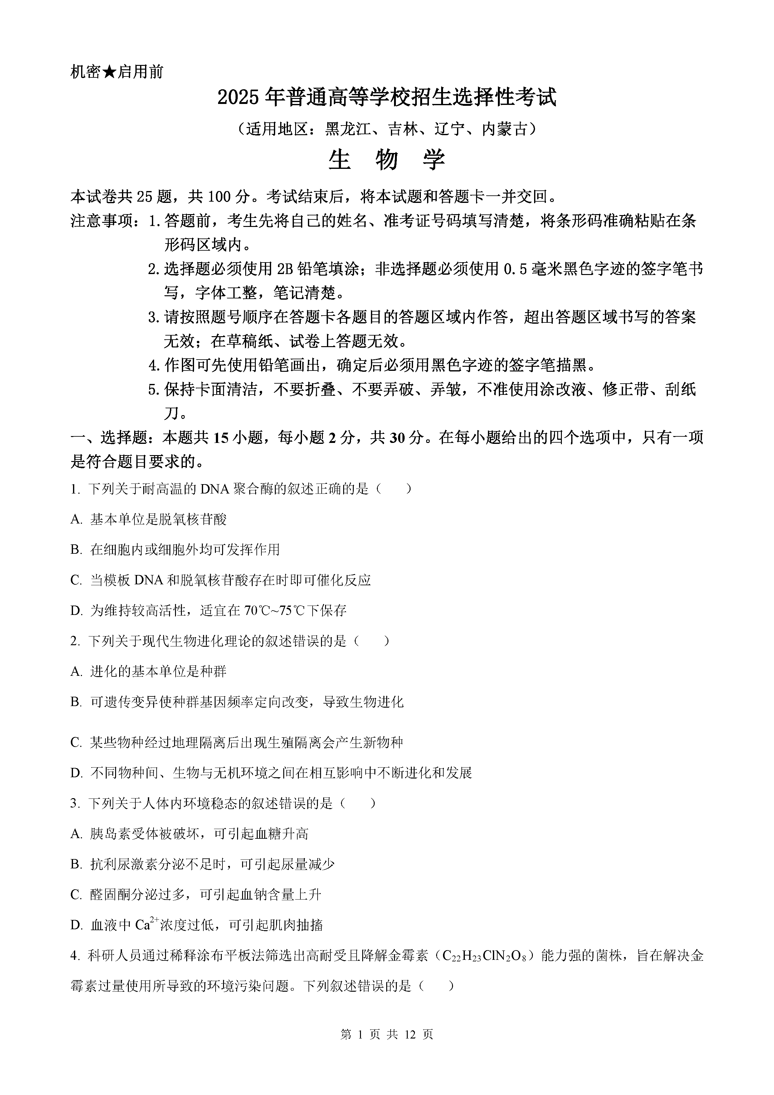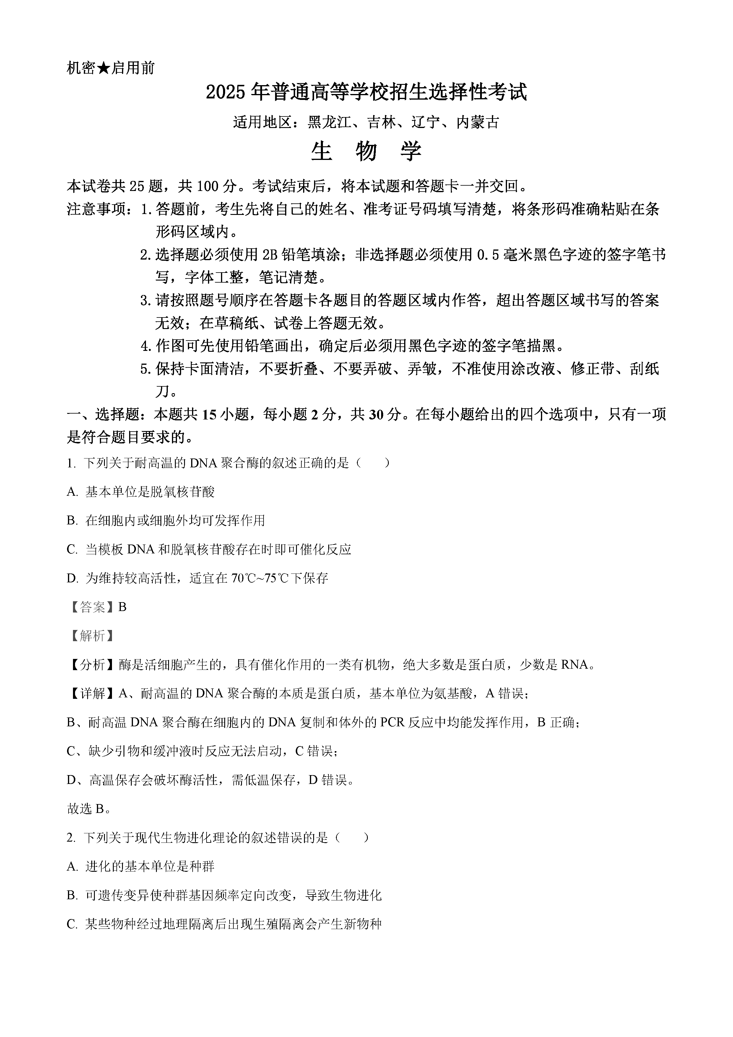 2025年黑龙江吉林辽宁内蒙高考生物试题及答案解析
