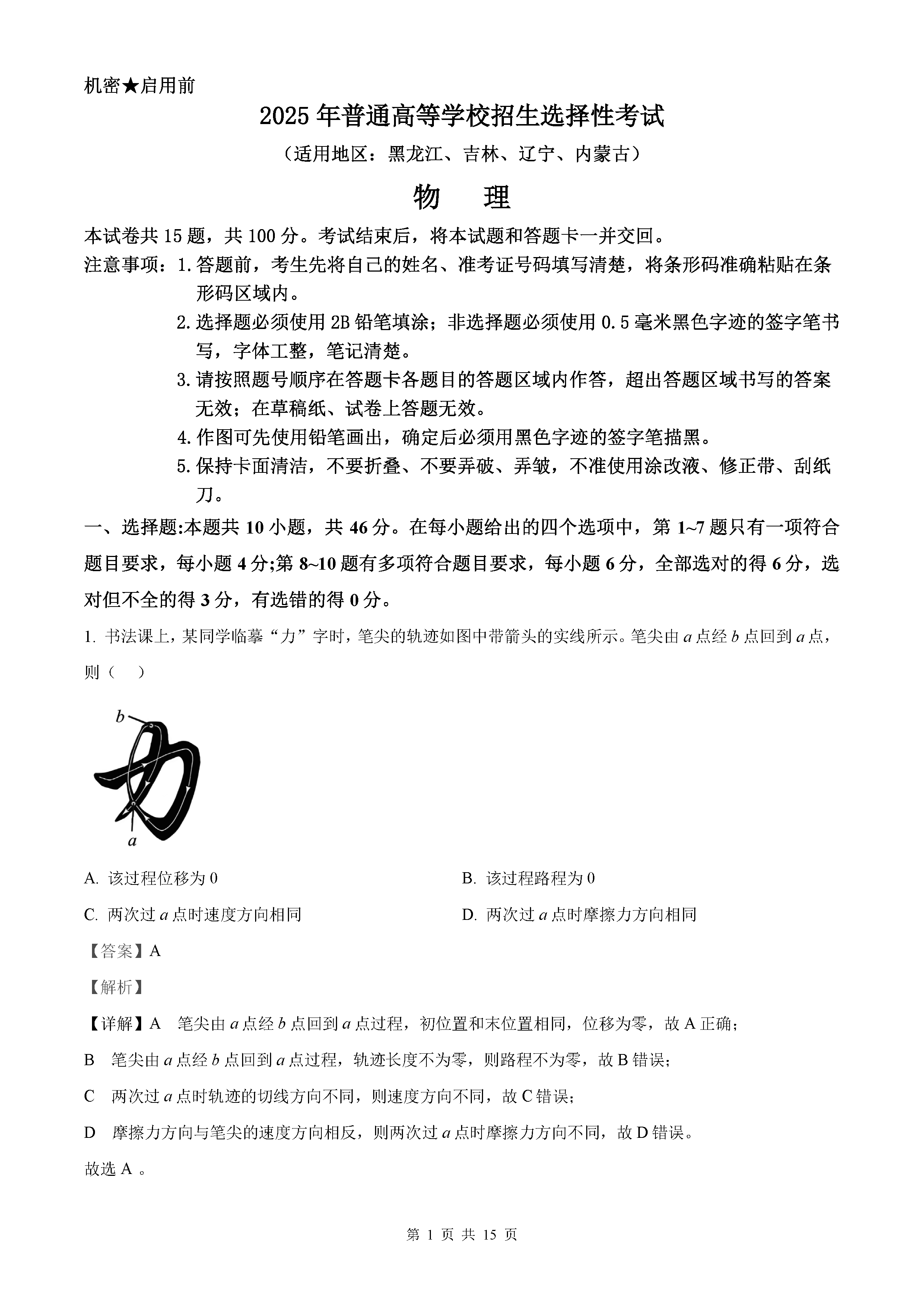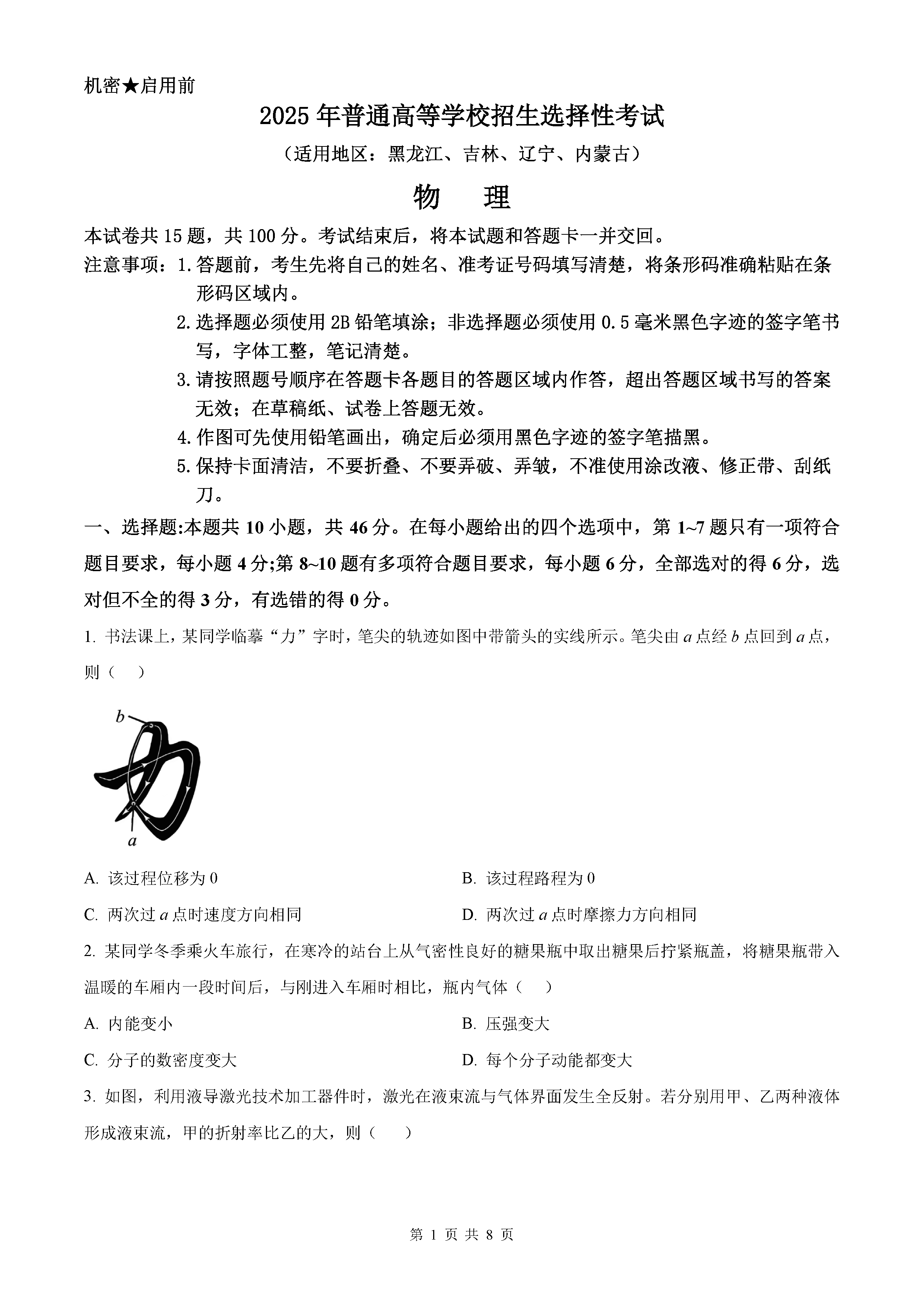 2025年黑龙江吉林辽宁内蒙高考物理试题及答案解析