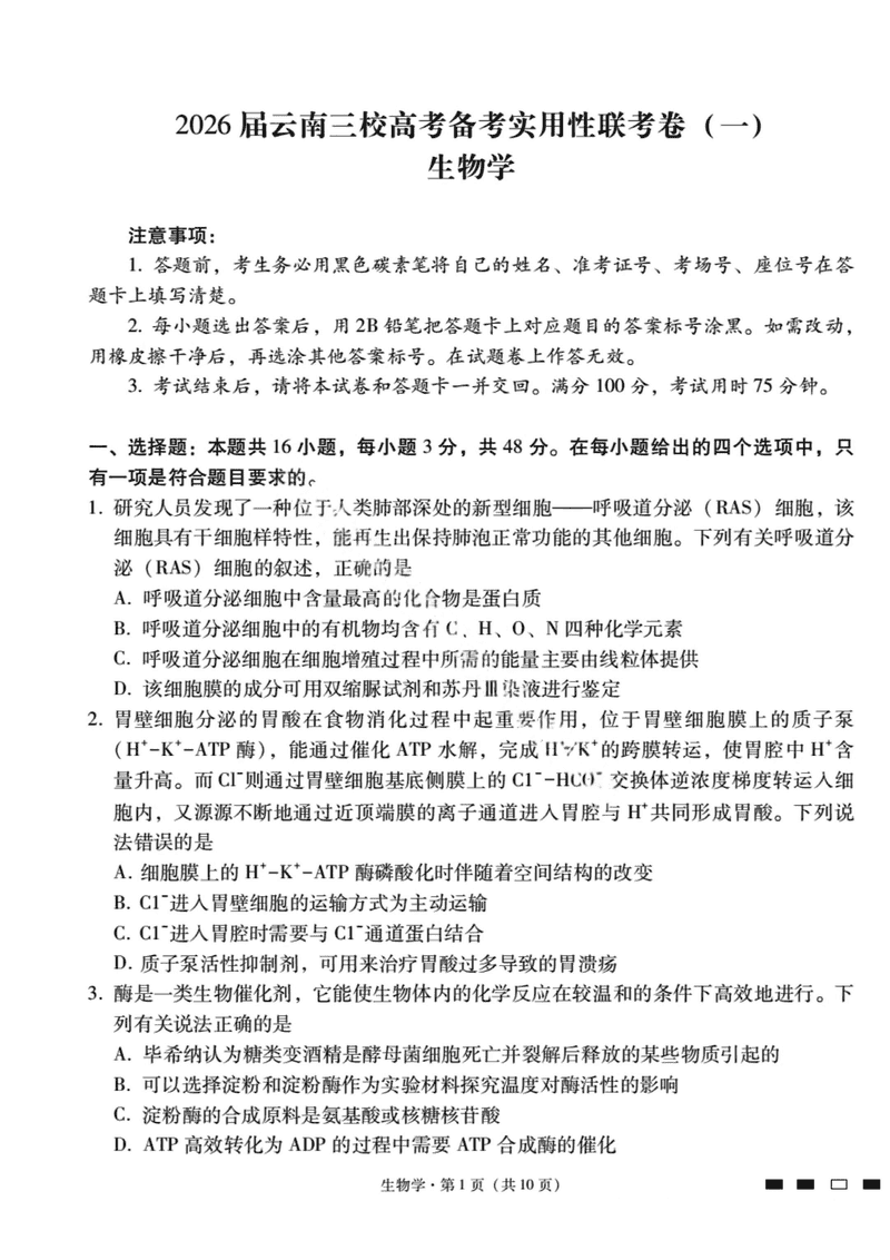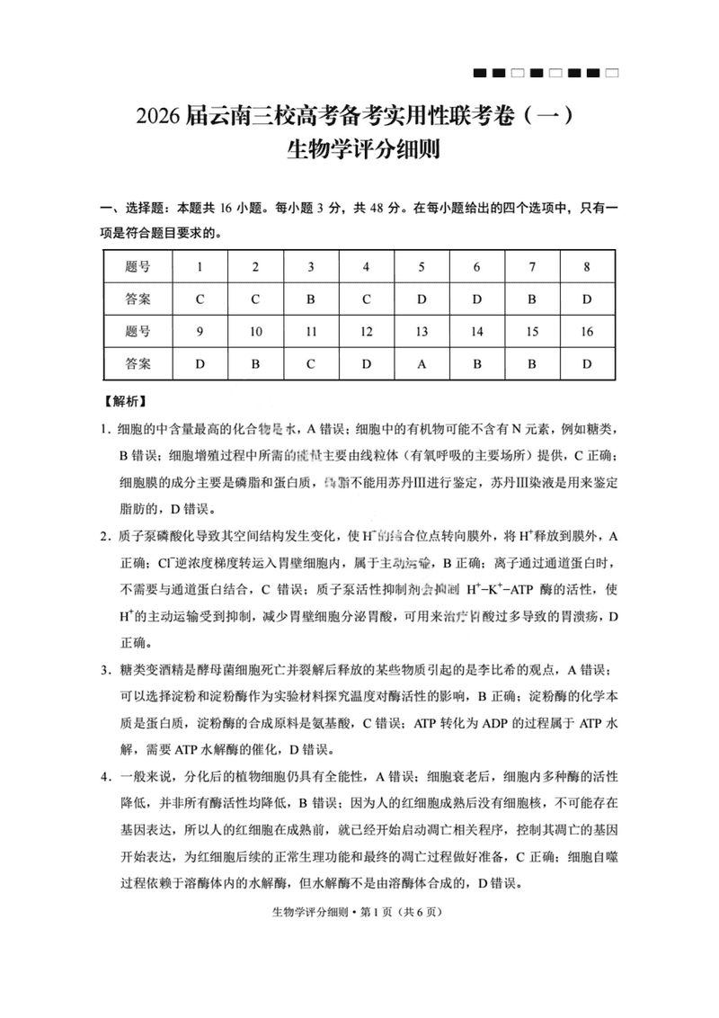2026届云南三校高考备考实用性联考试卷(一)生物考试已于近日开考,为方便考生考后及时查看考试情况,查漏补缺、弥补不足,本文整理了试题答案解析相关信息!