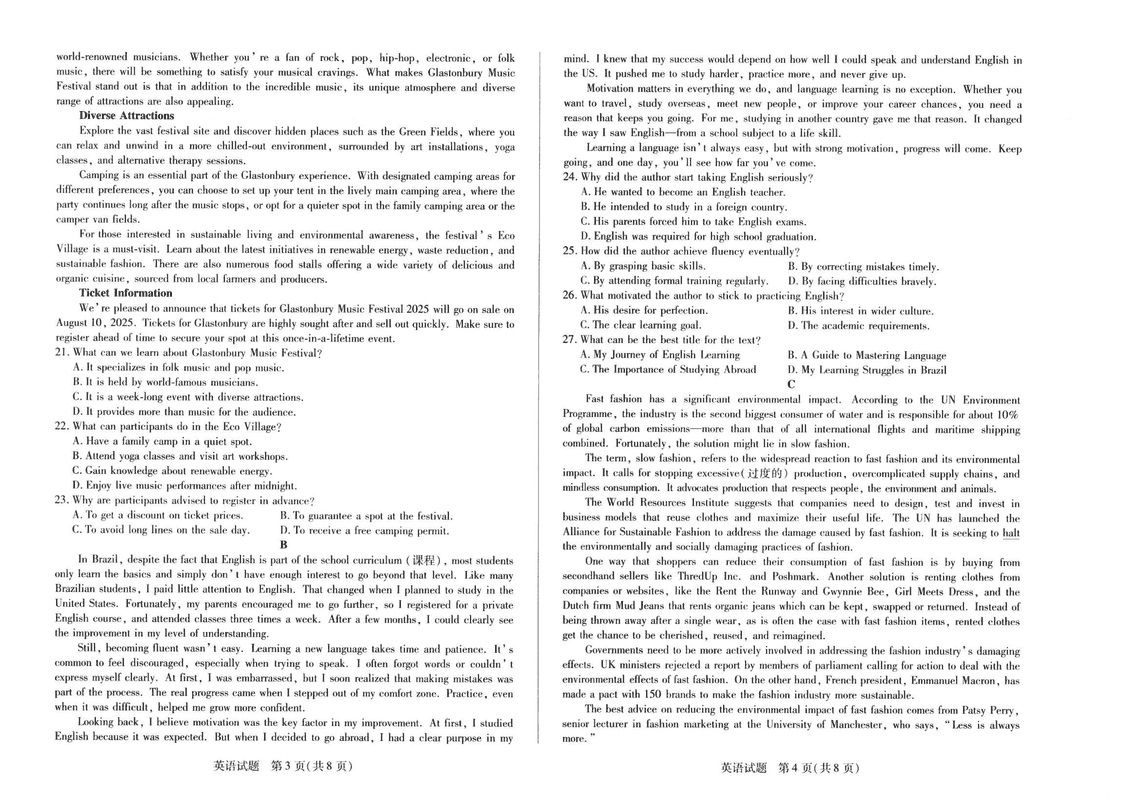 河南天一大联考2025年高二下学期期末学业质量监测英语试题及答案 时间:2025-06-19 河南 高中英语 河南天一大联考2025年高二下学期期末学业质量监测英语考试已于近日开考,为方便考生考后及时查看考试情况,查漏补缺、弥补不足,本文整理了试题答案解析相关信息! 英语试题及答案解析