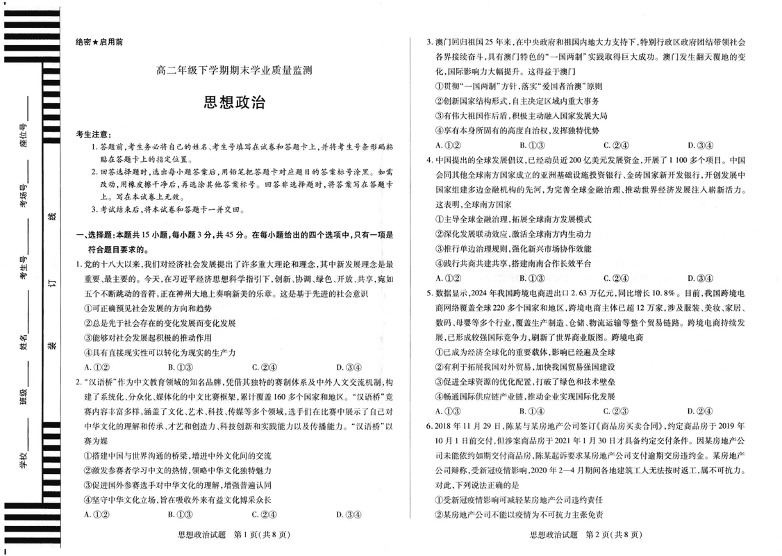 河南天一大联考2025年高二下学期期末学业质量监测政治试题及答案 时间:2025-06-19 河南 高中政治 河南天一大联考2025年高二下学期期末学业质量监测政治考试已于近日开考,为方便考生考后及时查看考试情况,查漏补缺、弥补不足,本文整理了试题答案解析相关信息! 政治试题及答案解析