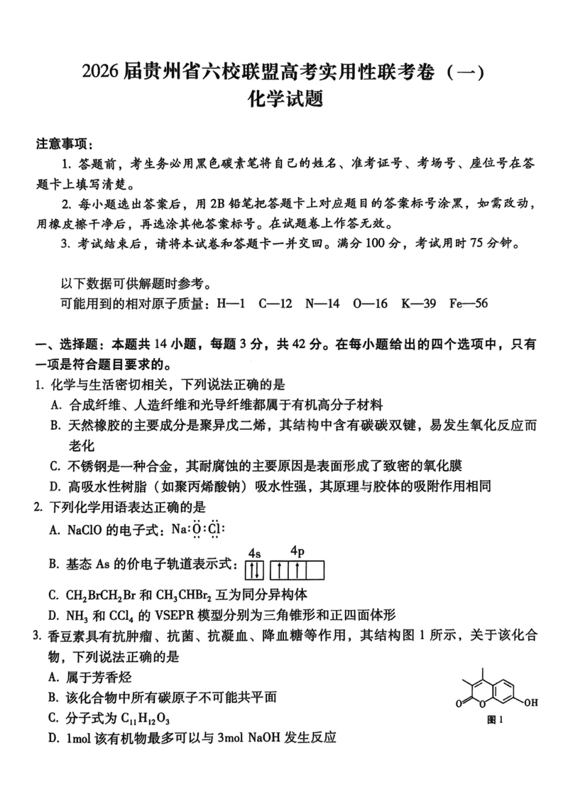 2026届贵州省六校联盟高考实用性联考卷(一)化学试题及答案