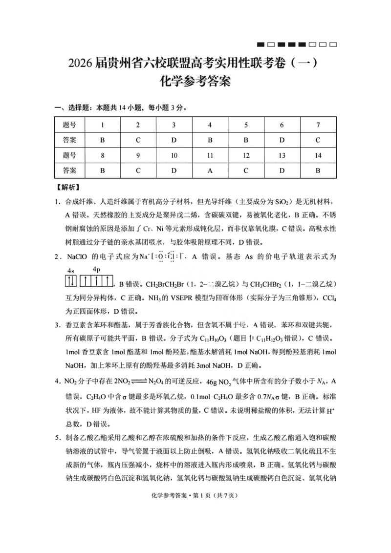 2026届贵州省六校联盟高考实用性联考卷(一)化学考试已于近日开考,为方便考生考后及时查看考试情况,查漏补缺、弥补不足,本文整理了试题答案解析相关信息!
