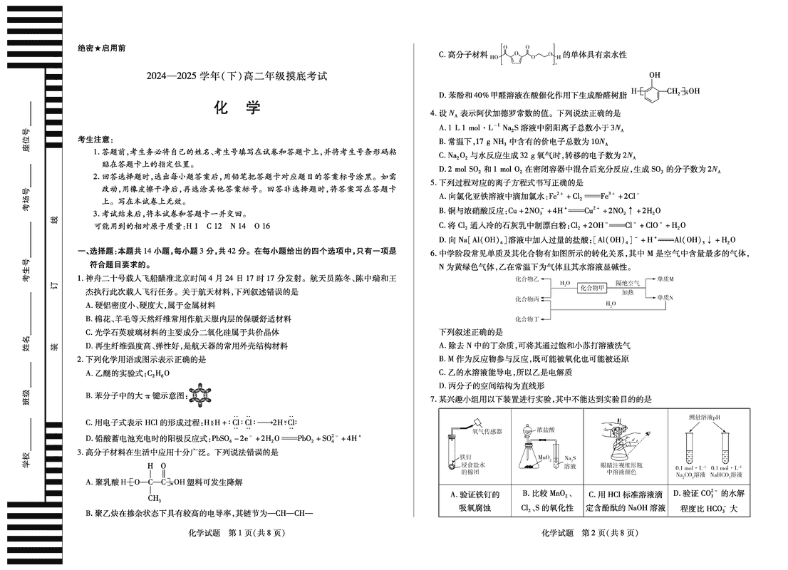 安徽天一大联考2024-2025学年高二下学期6月摸底化学试题及答案 时间:2025-06-22 安徽 高中化学 安徽省天一大联考2024-2025学年高二下学期6月摸底化学考试已于近日开考,为方便考生考后及时查看考试情况,查漏补缺、弥补不足,本文整理了试题答案解析相关信息! 化学试题及答案解析