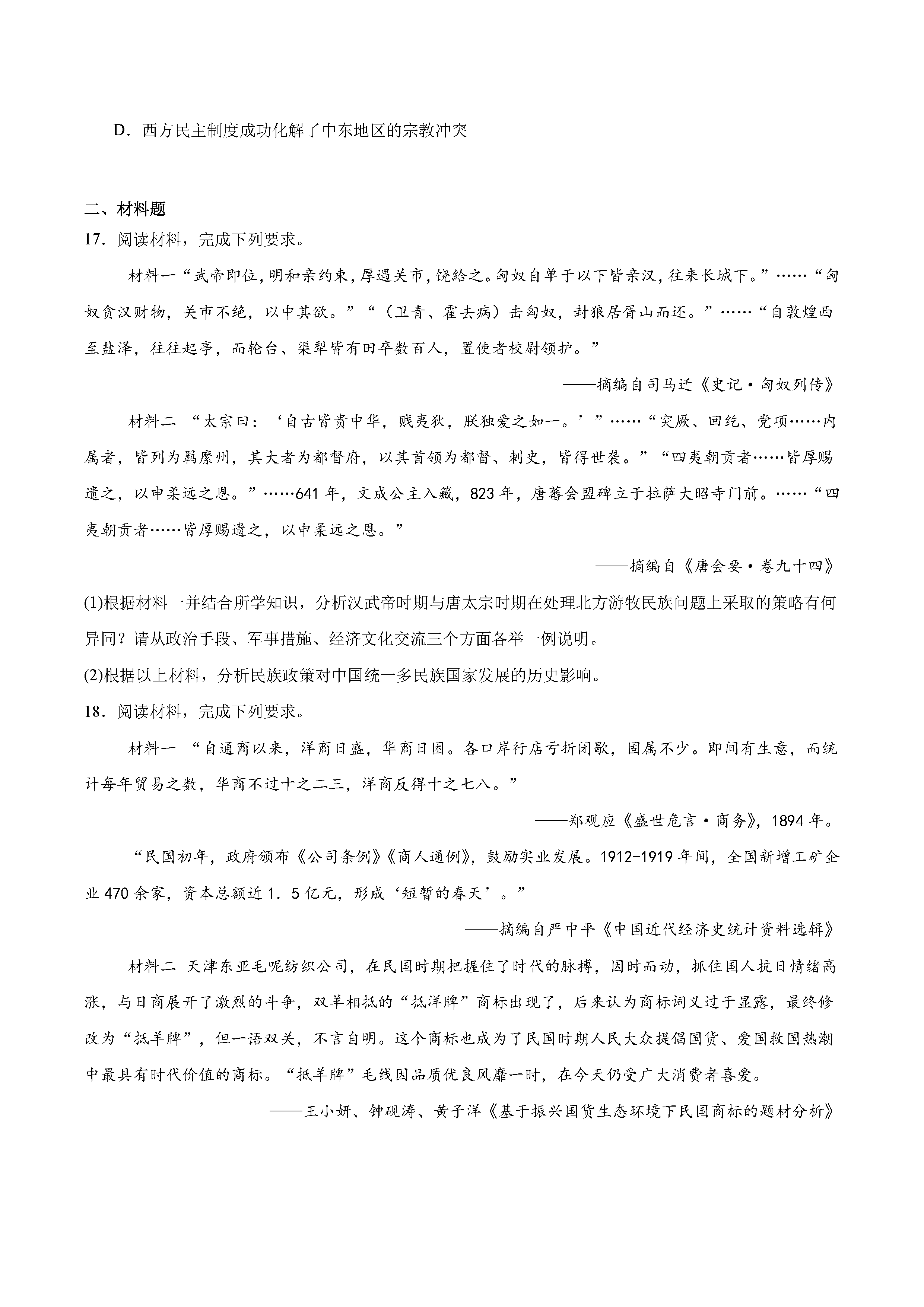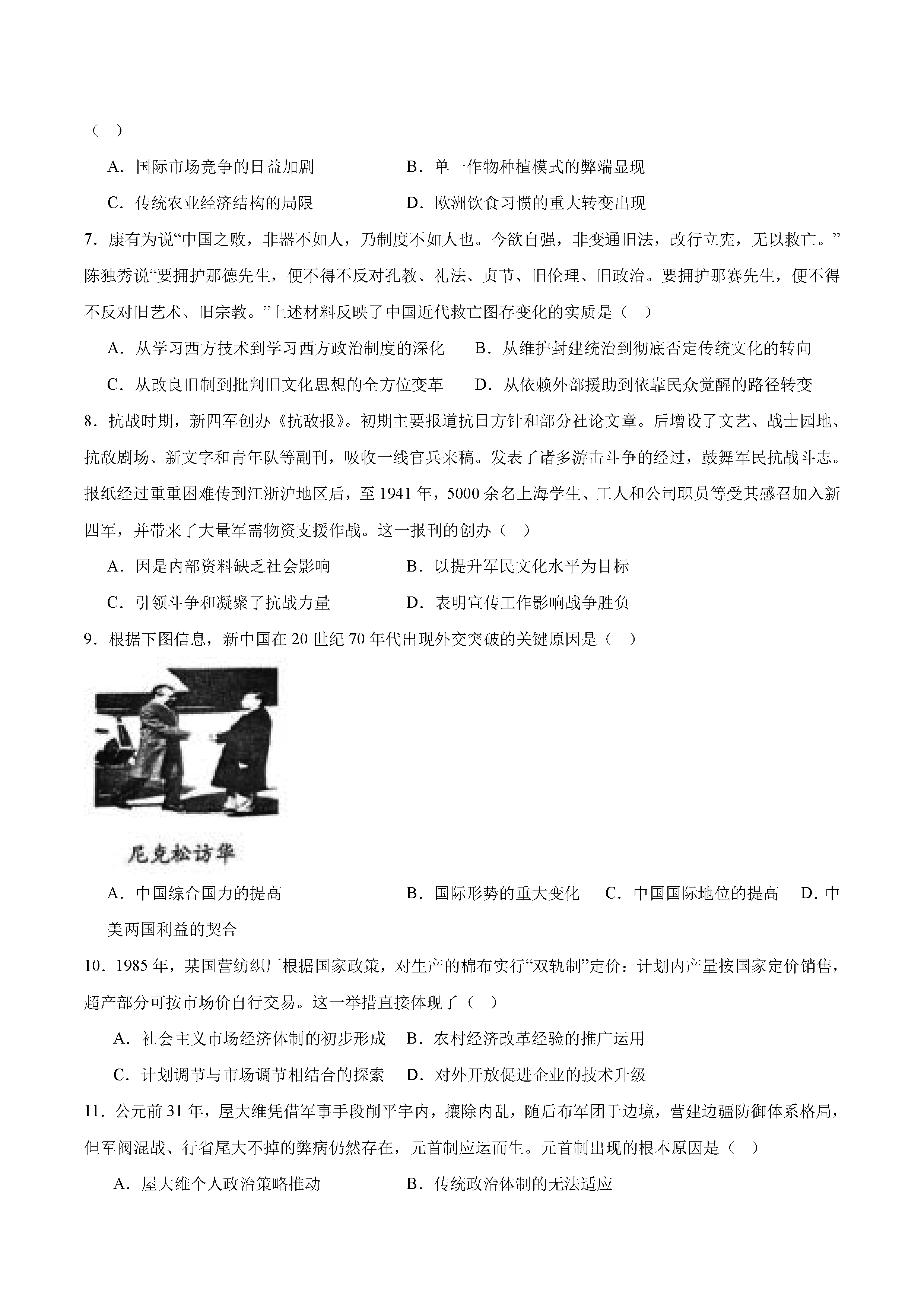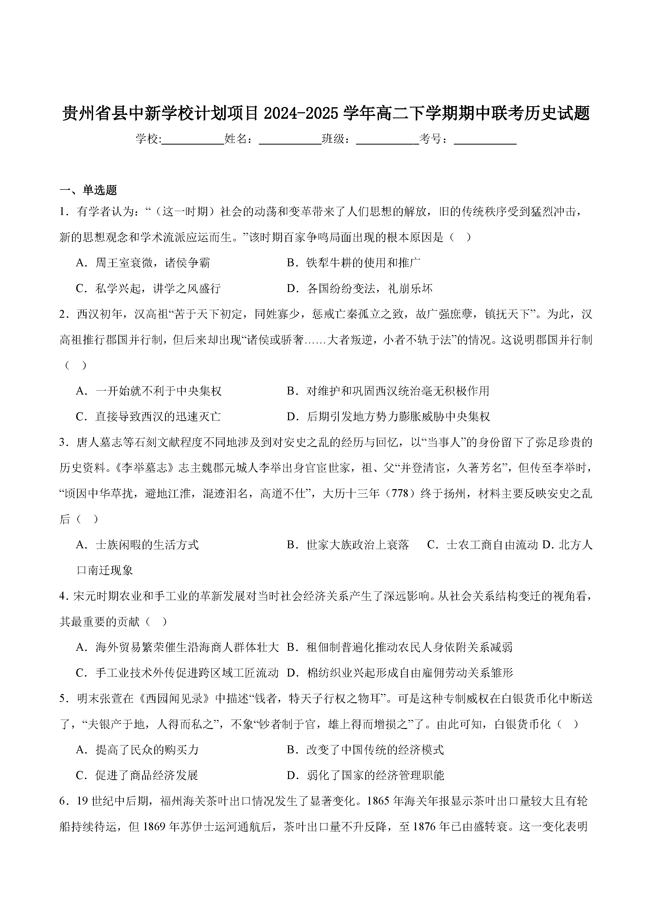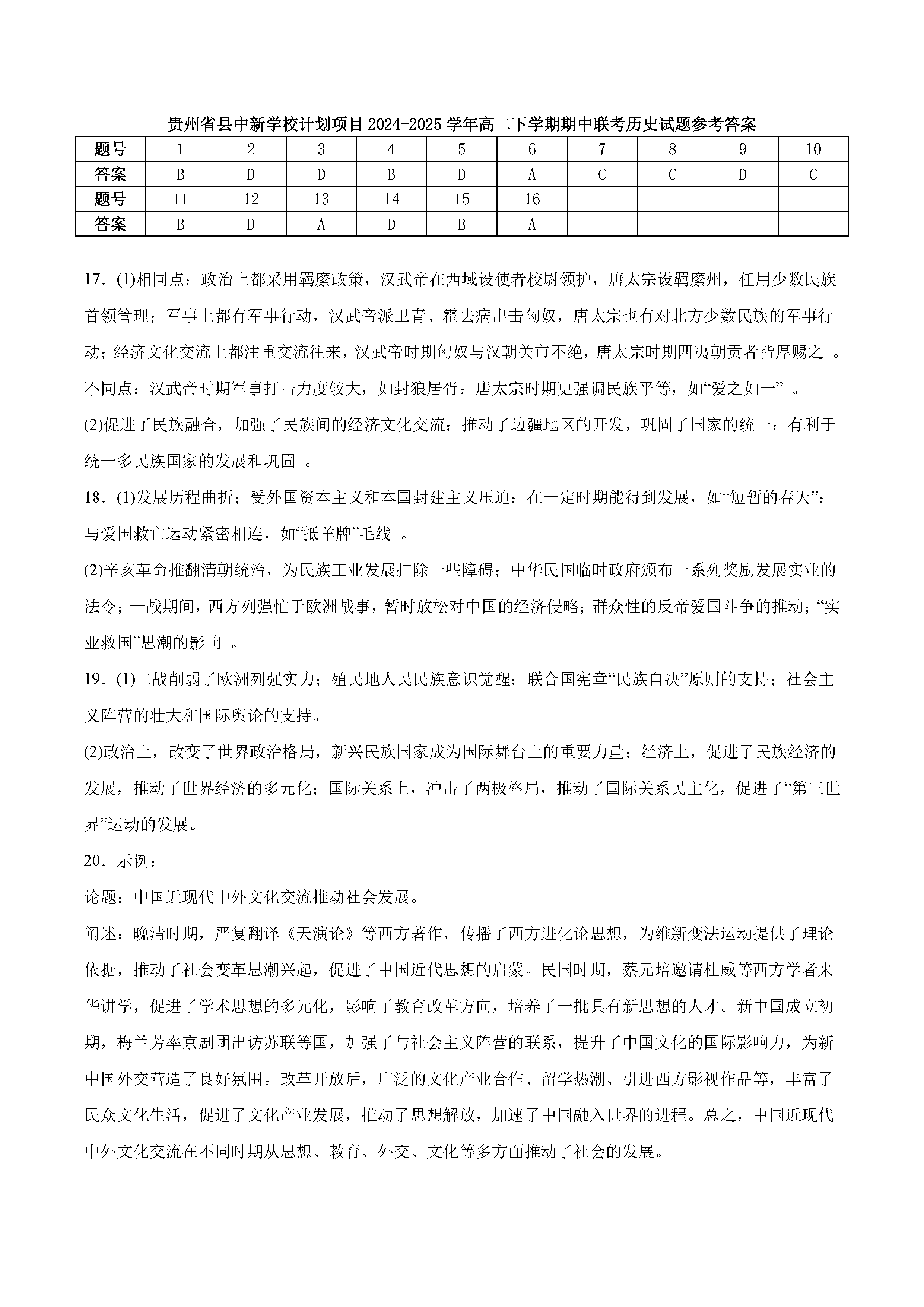 贵州省县中新学校计划项目2024-2025学年高二下学期期中联考历史试题及答案