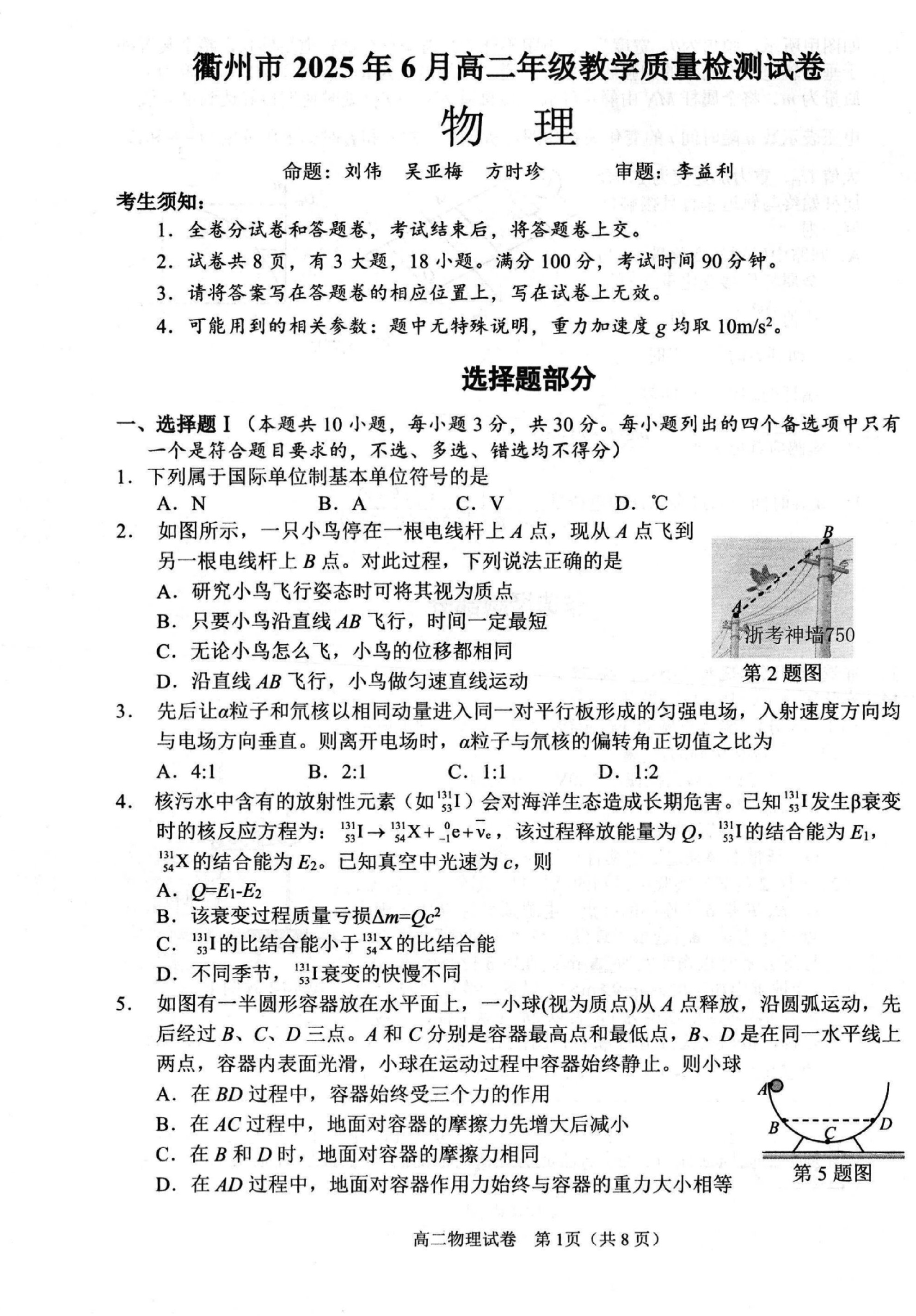 衢州市2025年6月高二下学期教学质量检测物理试题及答案 时间:2025-06-22 浙江 高中物理 浙江省衢州市2025年6月高二下学期教学质量检测物理考试已于近日开考,为方便考生考后及时查看考试情况,查漏补缺、弥补不足,本文整理了试题答案解析相关信息! 物理试题及答案解析
