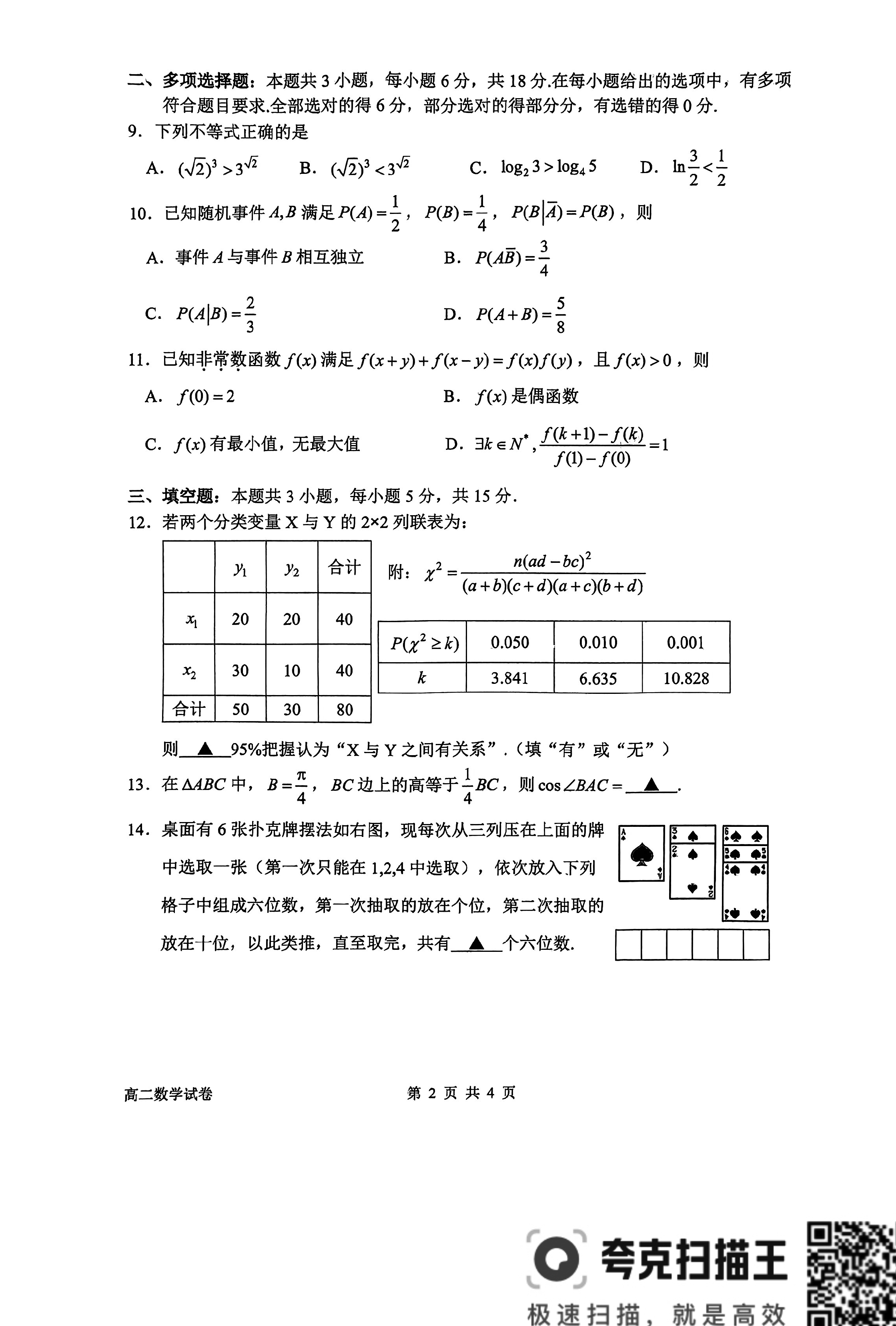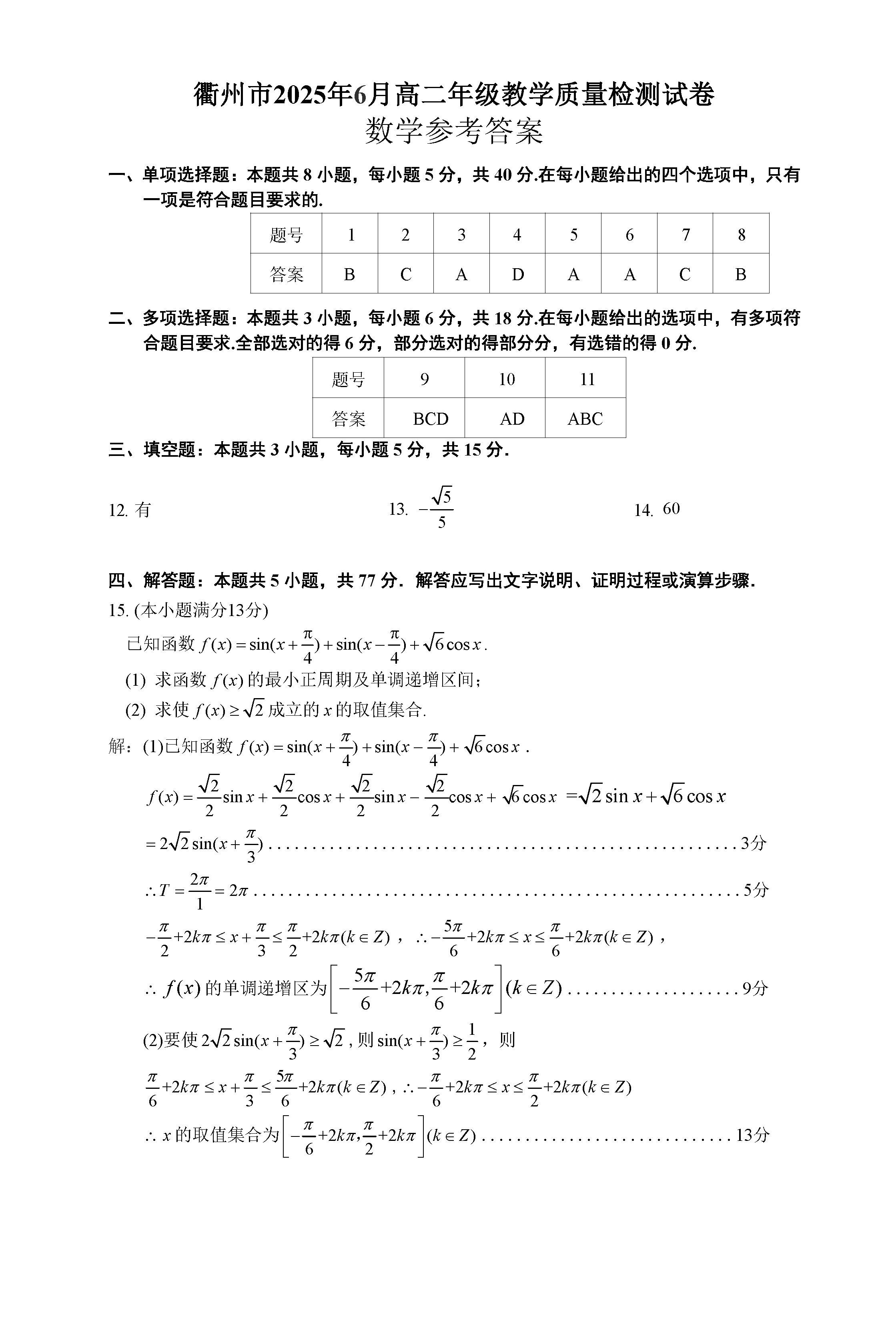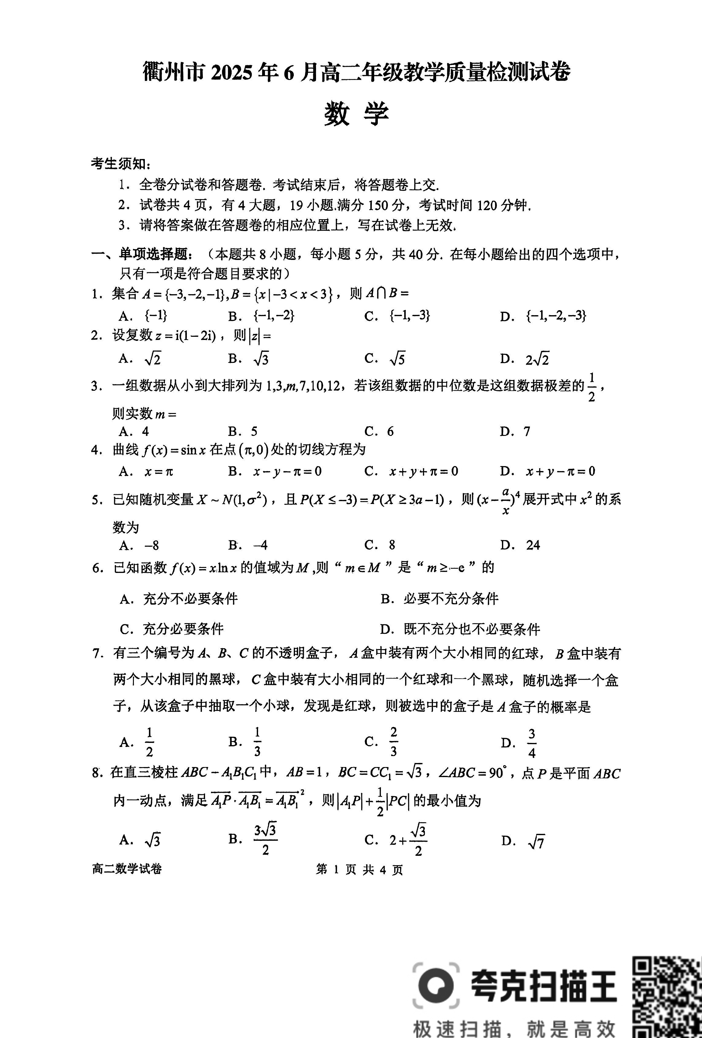 衢州市2025年6月高二下学期教学质量检测数学试题及答案 时间:2025-06-22 浙江 高中数学 浙江省衢州市2025年6月高二下学期教学质量检测数学考试已于近日开考,为方便考生考后及时查看考试情况,查漏补缺、弥补不足,本文整理了试题答案解析相关信息! 数学试题及答案解析
