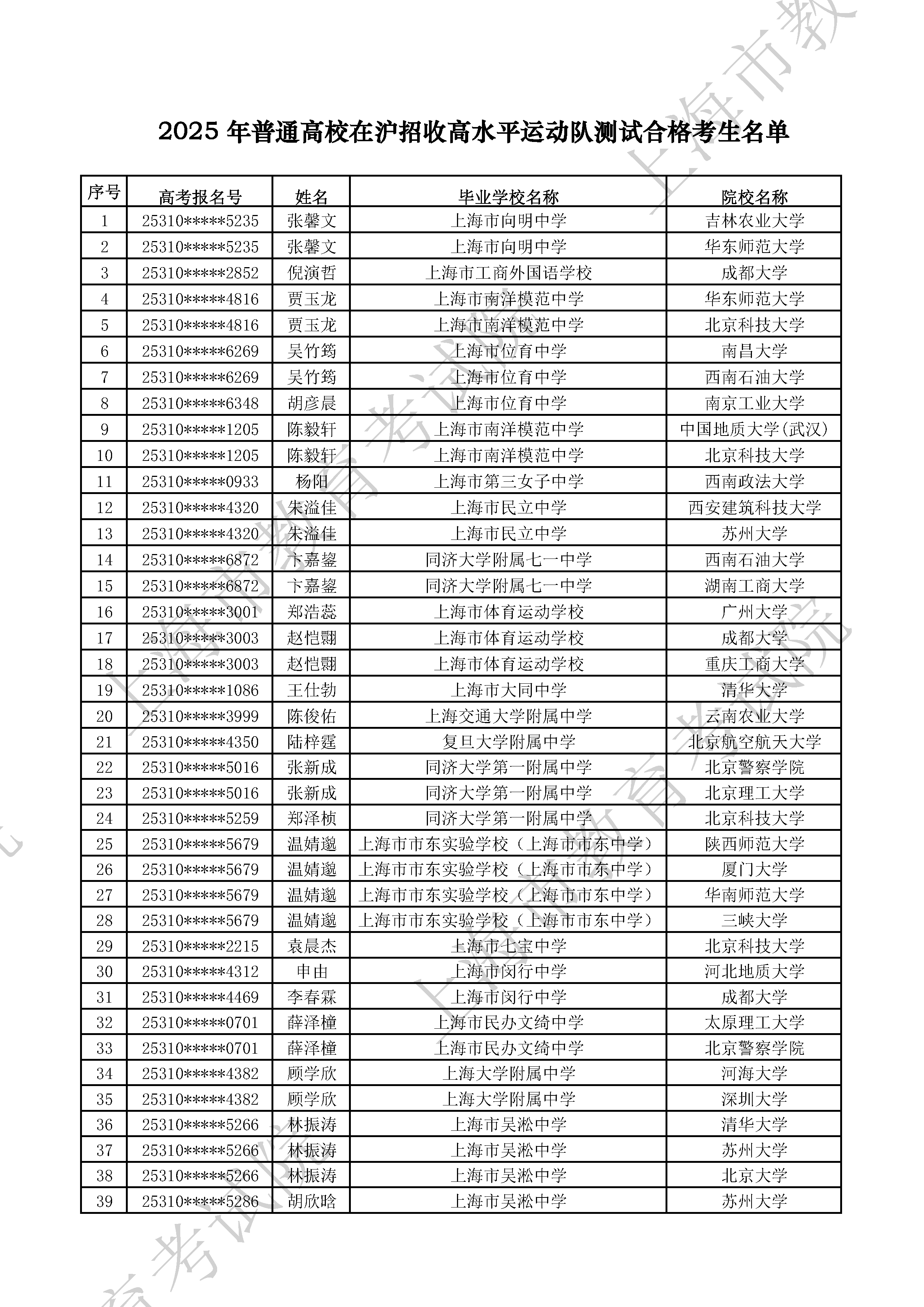2025年普通高校在沪招收高水平运动队测试合格考生名单公示