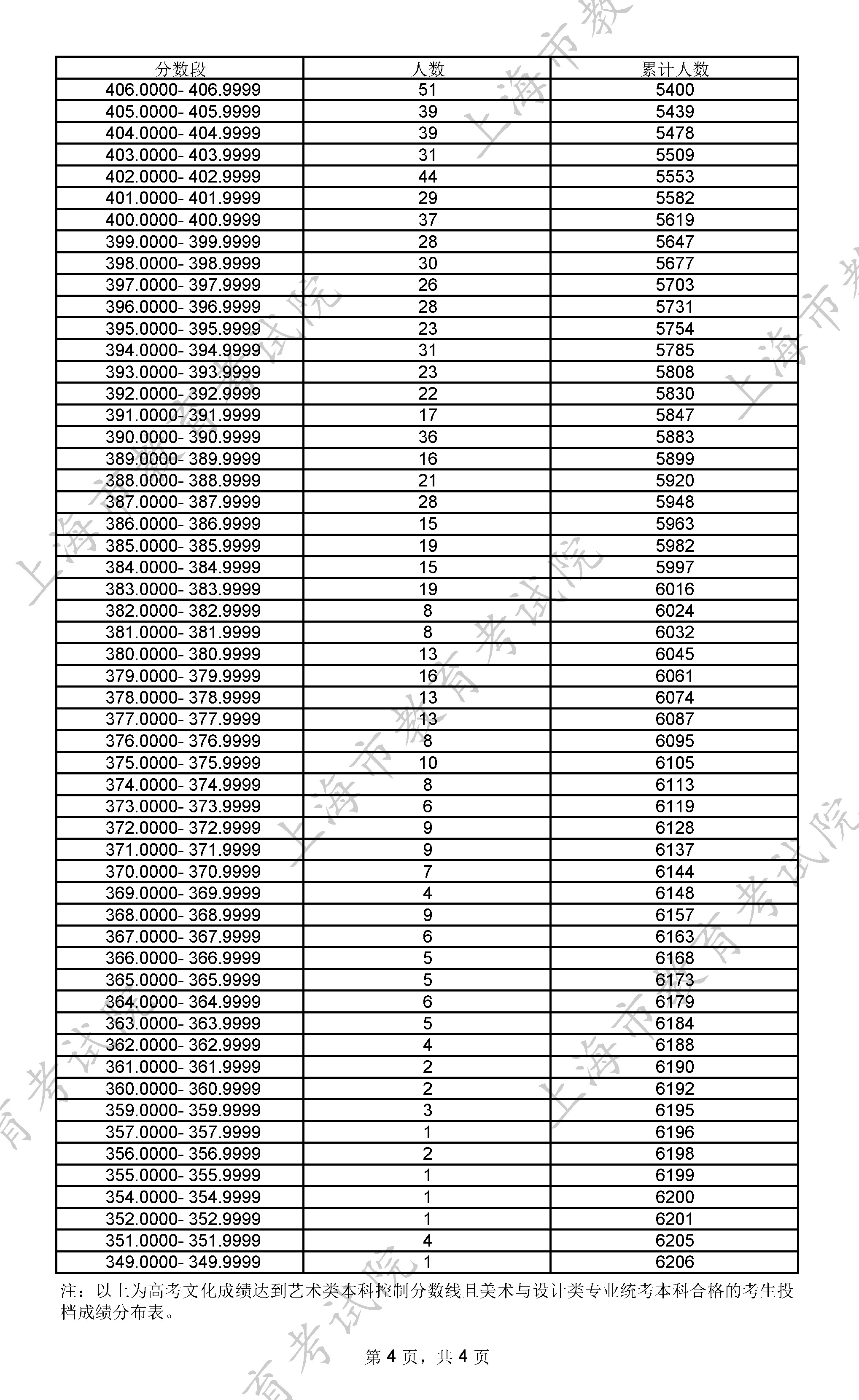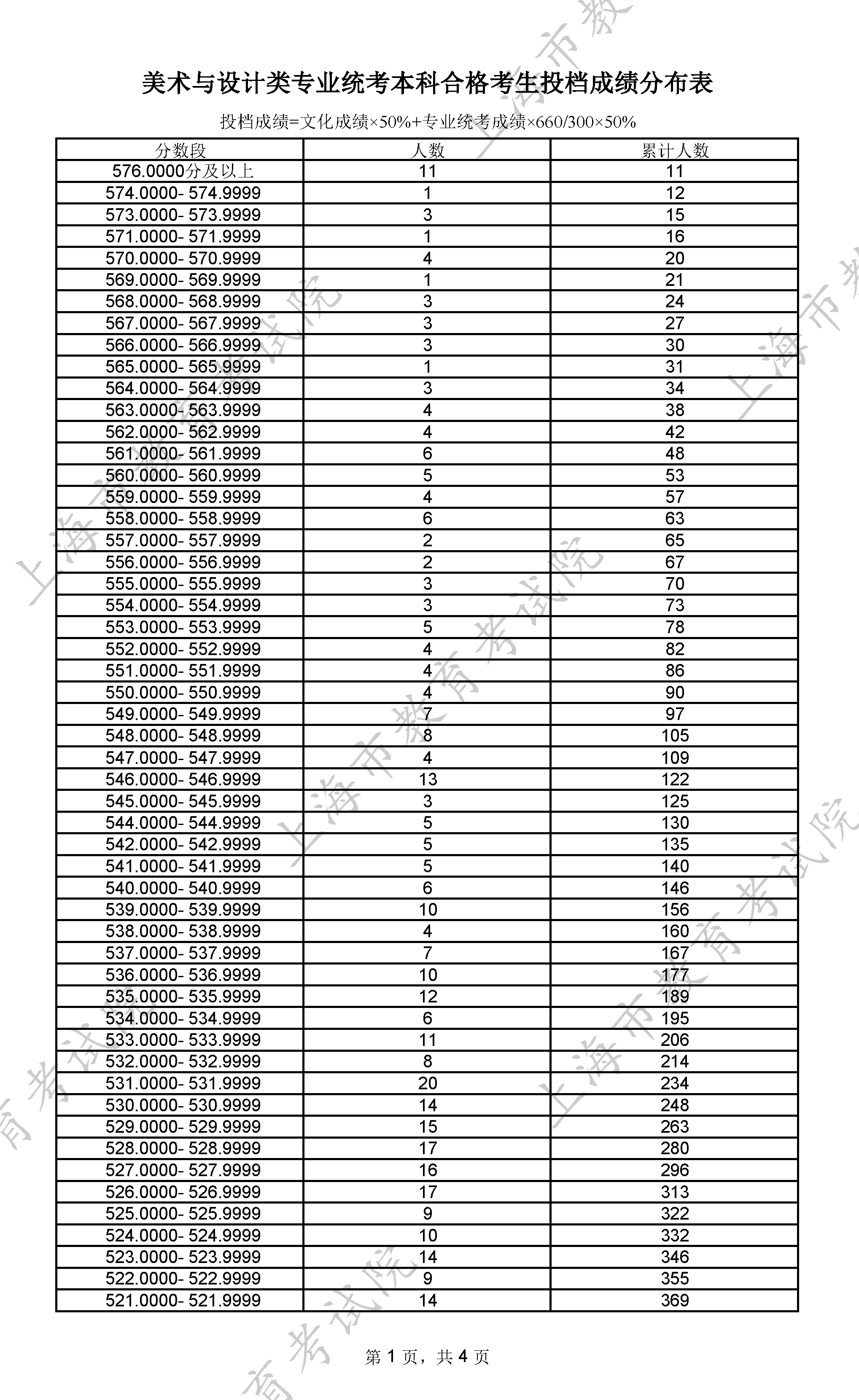 美术与设计类专业统考本科合格考生投档成绩分布表